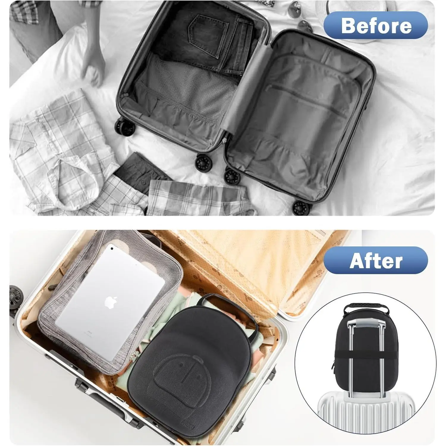 The strap on the back of the cap carrier can be securely fastened to the handle of the suitcase.This convenient feature allows for hands-free travel, ensuring that your bags stay together and are easier to manage
