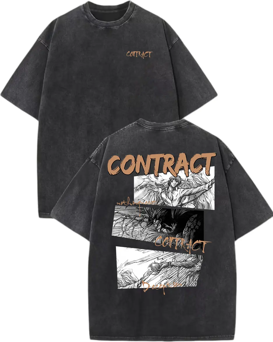This T-shirt features a vintage acid wash design, inspired by "Death Note." It showcases Light Yagami & Ryuk silhouettes, perfect for fans of the "God of the New World" anime. The graphic tee is a must-have for streetwear enthusiasts.