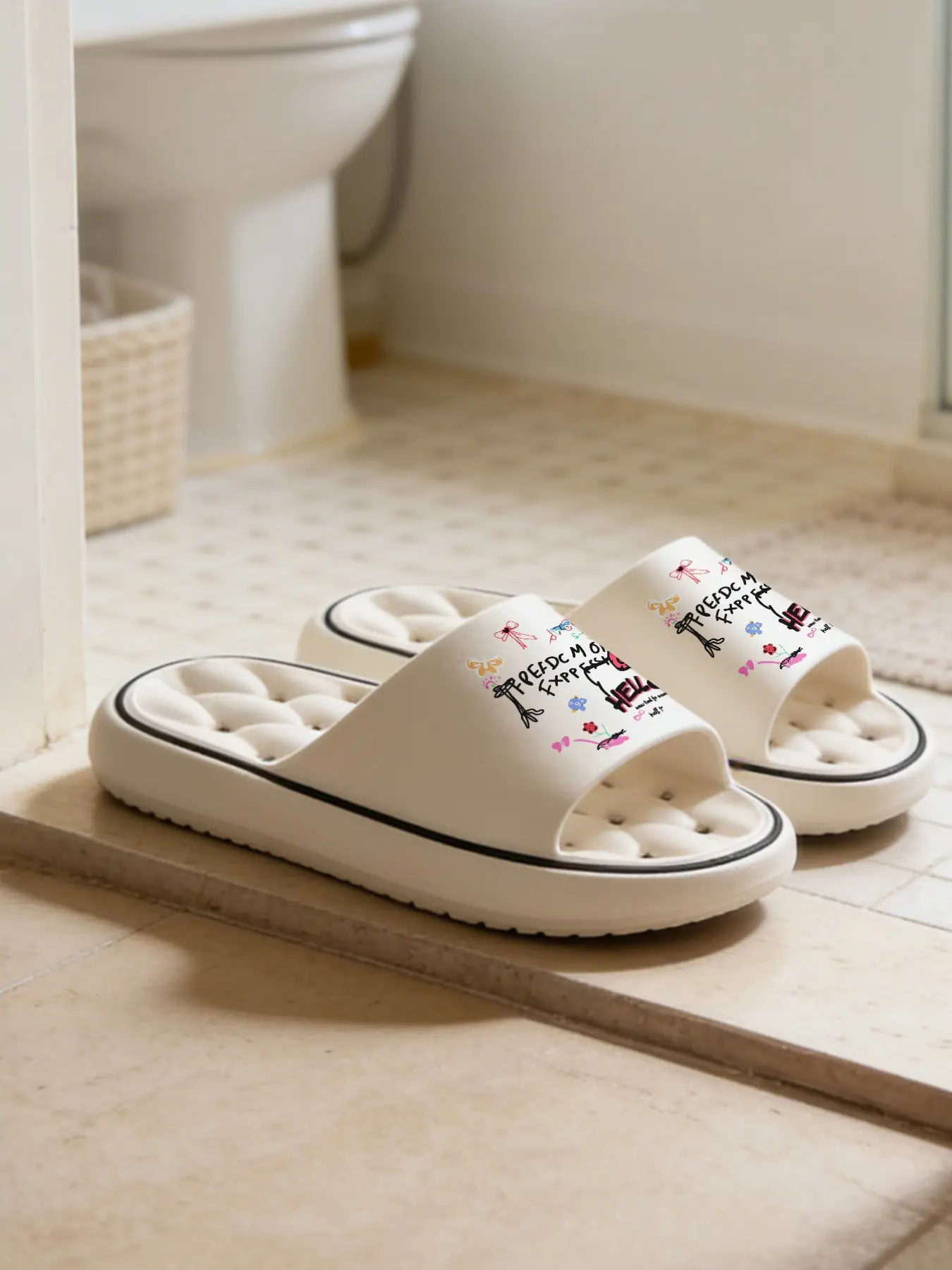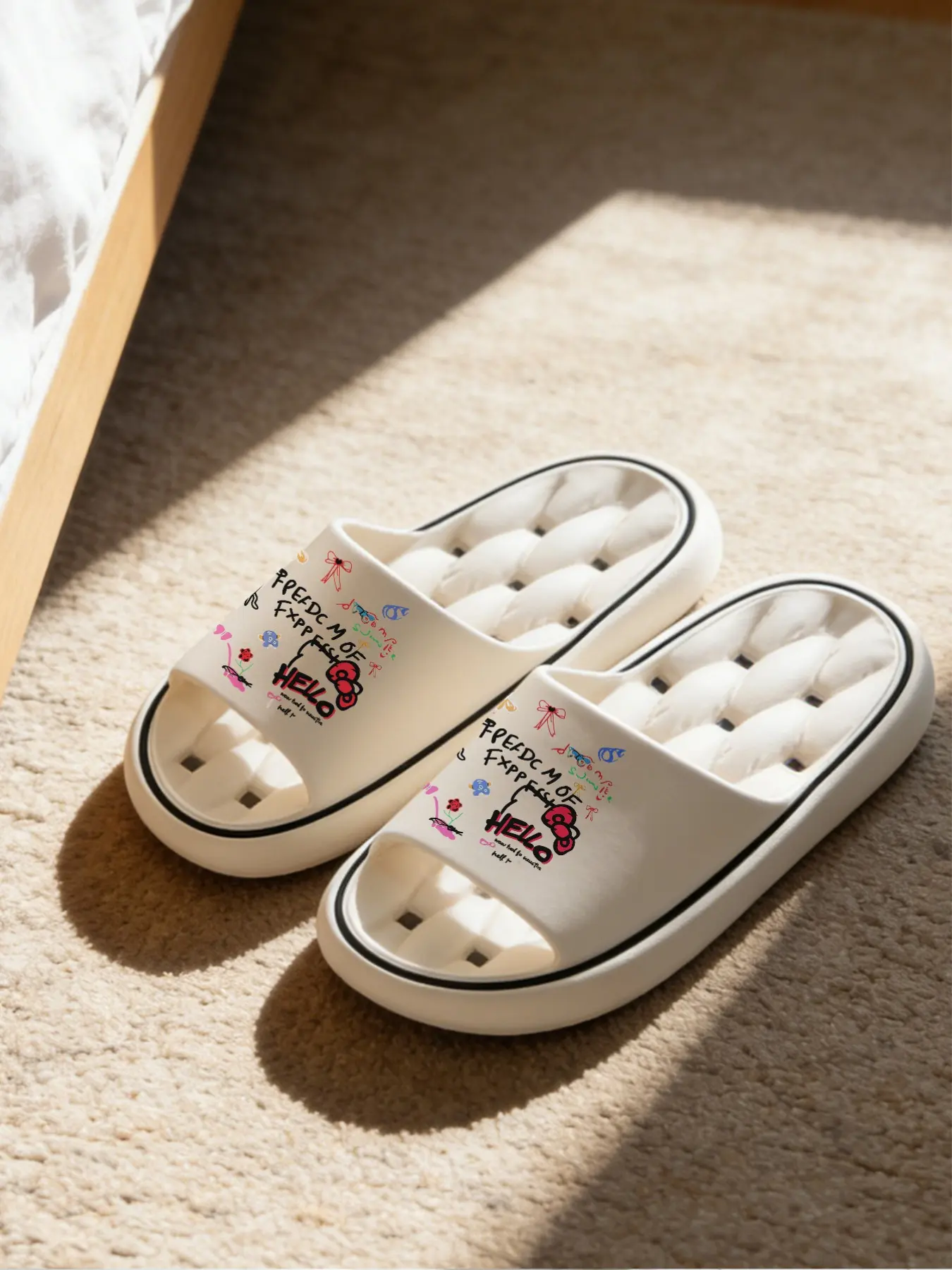 1 Pair Graffiti Letter Bow Themed Printed Hollow Massage Thick Sole Slippers, Sweet Cool Personality Style, Non-slip Soft Sole, Quick-dry for Bathroom, Indoor & Outdoor Dual-use, Open Toe Slides, Bathroom Casual Slippers