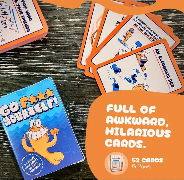 ·UNFILTERED ADULT FUN; Take classic Go Fish and crank it up, with our go fish card game for Grown up, outrageous offensive prompts and the iconic “Go f yourself!” shout, this card game delivers raw laughs and party energy for daring players