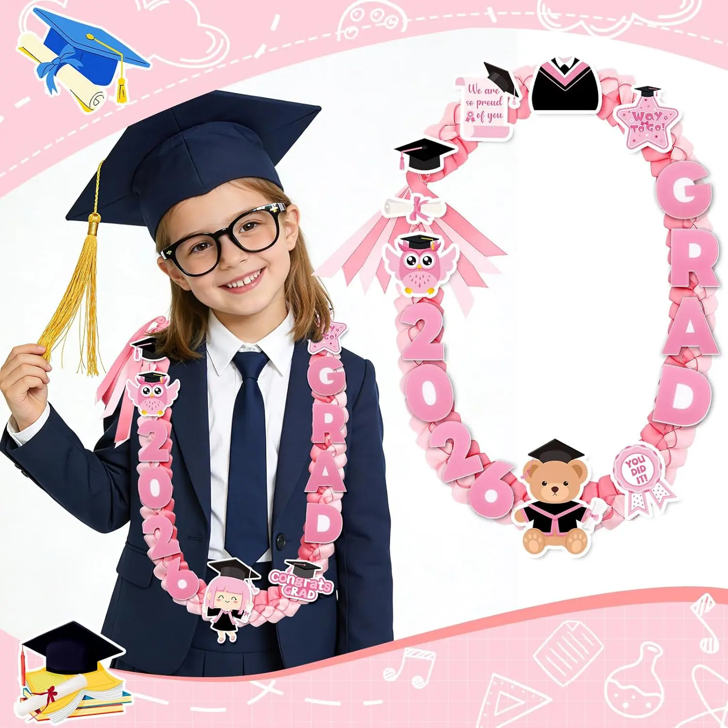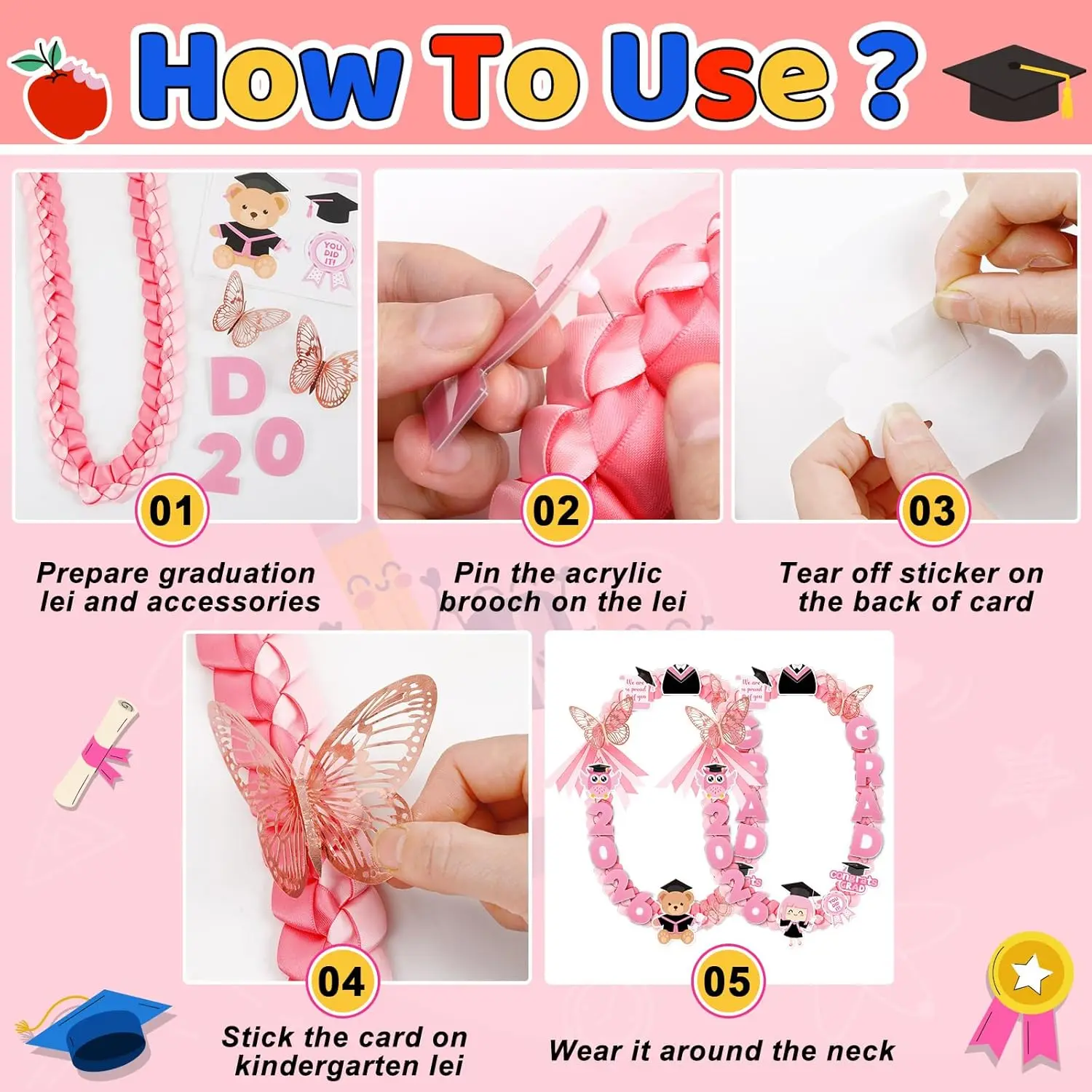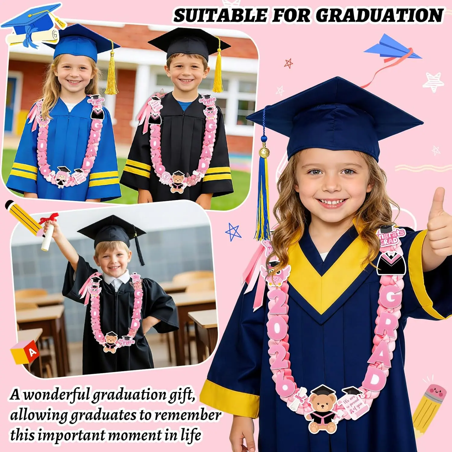 Celebrate your little one’s big achievement with kindergarten graduation leis set!Specially designed for the class, kindergarten leis set includes a beautifully crafted pink kindergarten graduation lei and 12 exquisite embroidered pins, making kindergarten graduation leis the good accessory for graduation ceremonies, parties, or photo sessions.