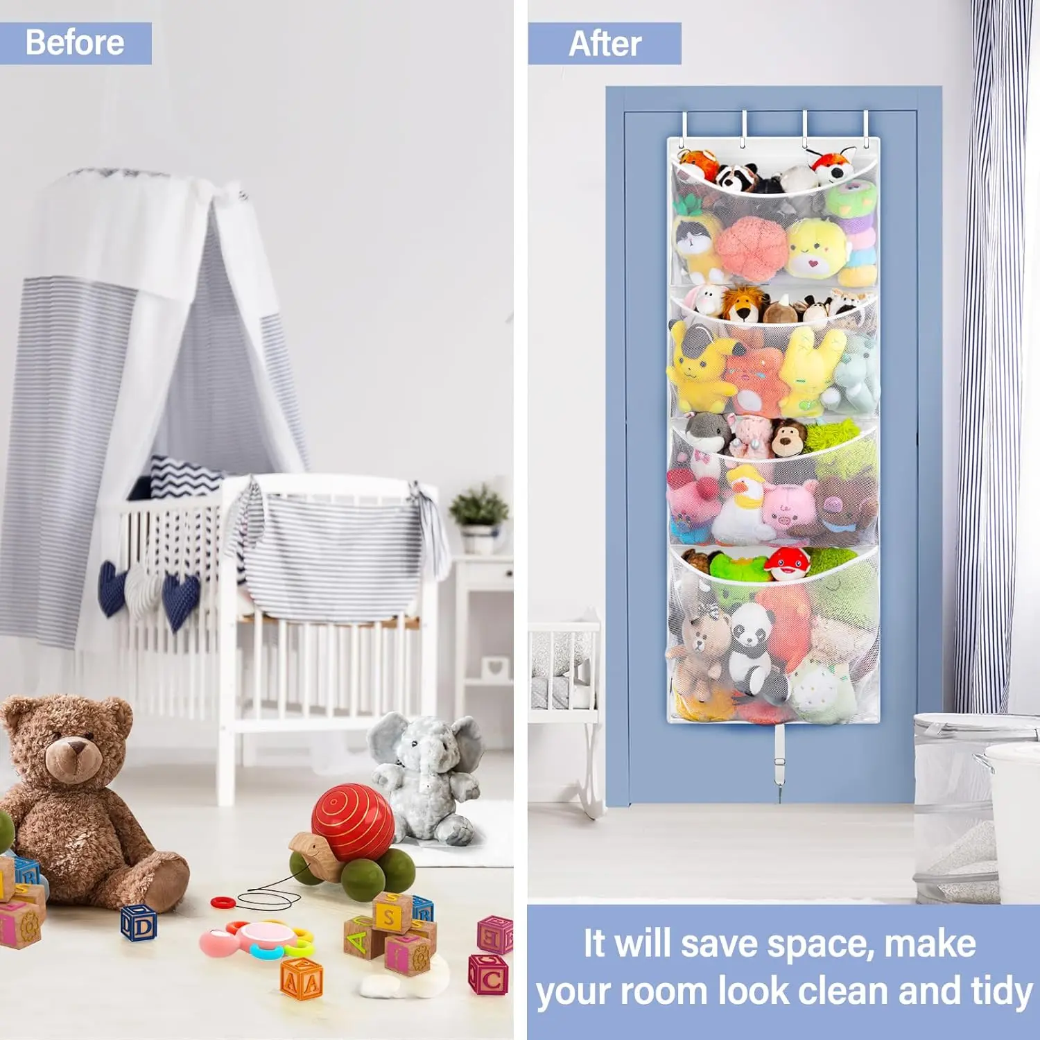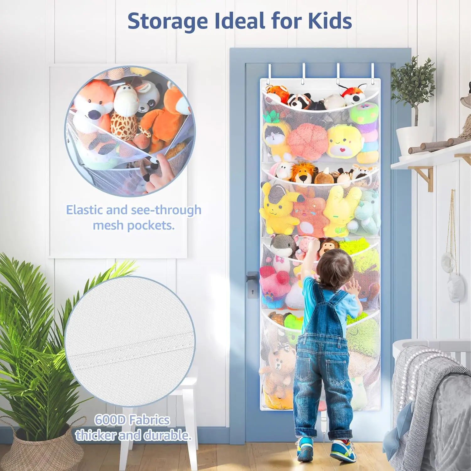 SUNDAY MIRTH Hanging Stuffed Animal Storage, Over Door Large Plush Toy Organizer with Metal Hook, Baby Accessory Holder Idea for Nursery, Doll & Bear Mesh Hammock Bag for Girl Boy Kid Room