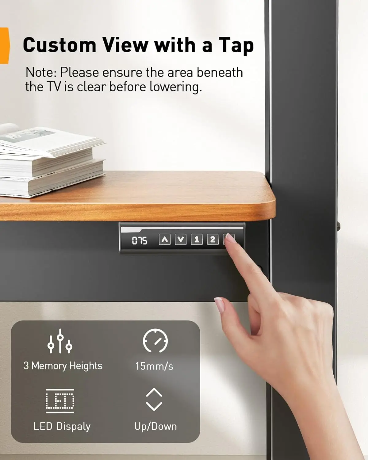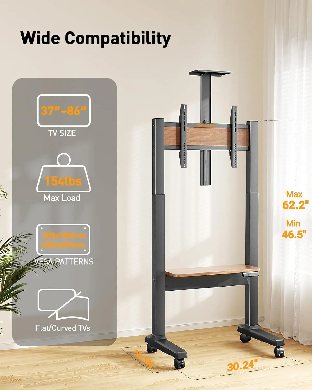 ·Equipped with a silent motor lifting at 15mm/s, this rolling TV stand allows smooth, effortless height adjustments. It includes a wooden storage shelf for accessories, a top tray for projectors or cameras, and a stylish wooden panel—combining functionality and elegance in one versatile TV stand.