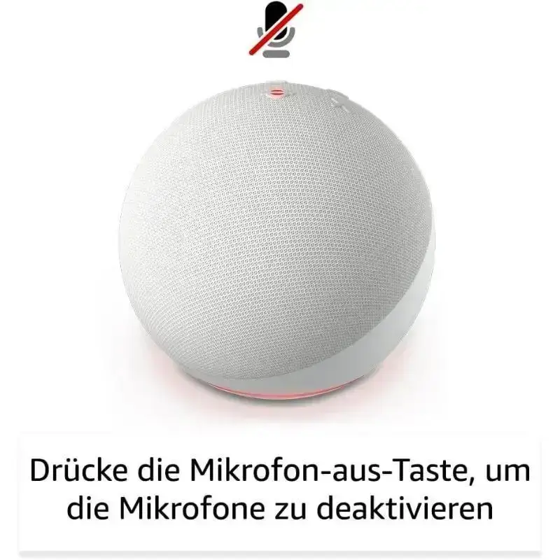 This speaker is designed with multiple privacy controls, including a Microphone Off button. It uses 99%25 packaging from responsibly managed forests or recycled sources, 95%25 post-consumer recycled fabric, and 55%25 post-consumer recycled plastics.