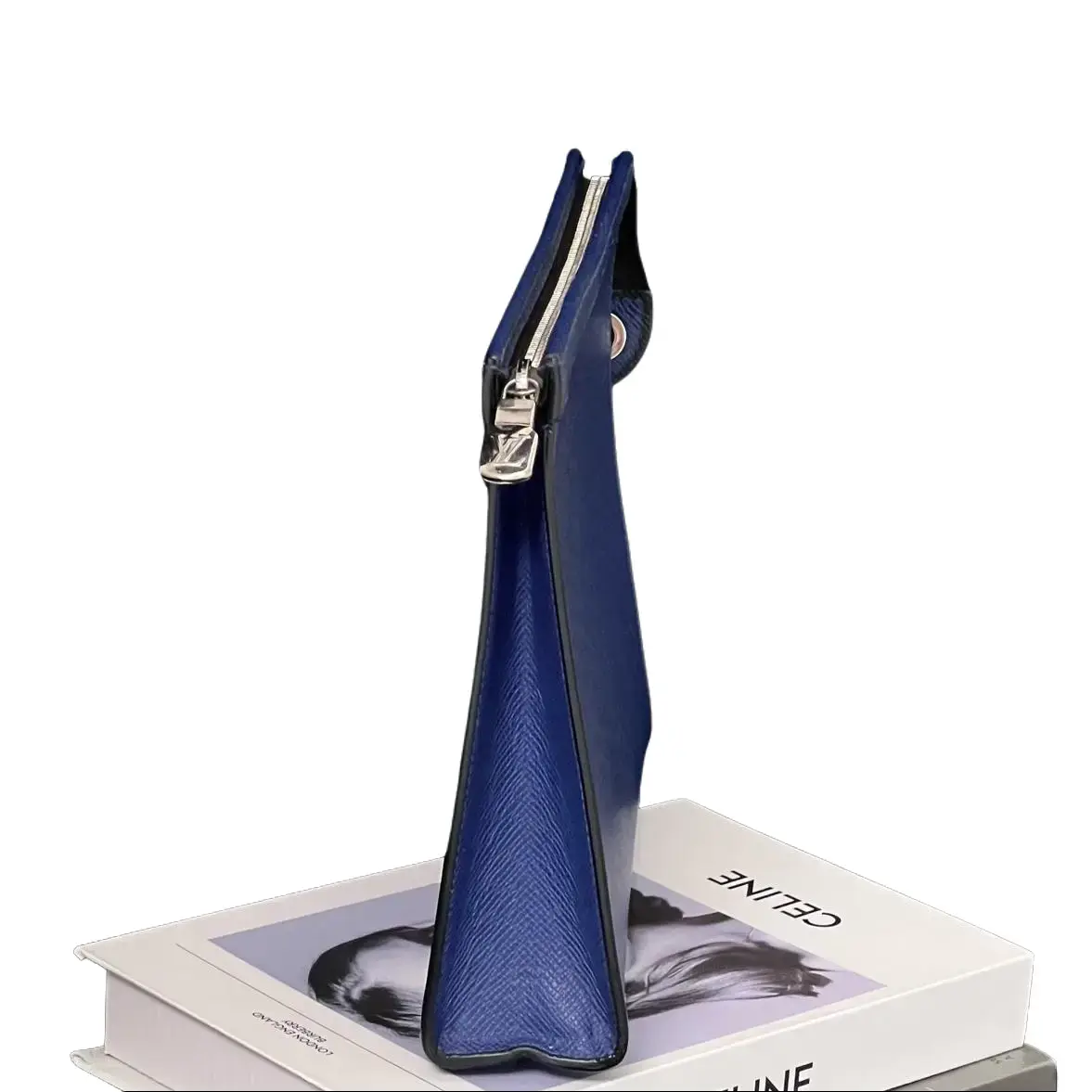 This versatile accessory is a must-have for those who appreciate both style and practicality. The blue leather and silver hardware make it a standout piece. Perfect for travel or as a clutch, it offers convenience and sophistication.