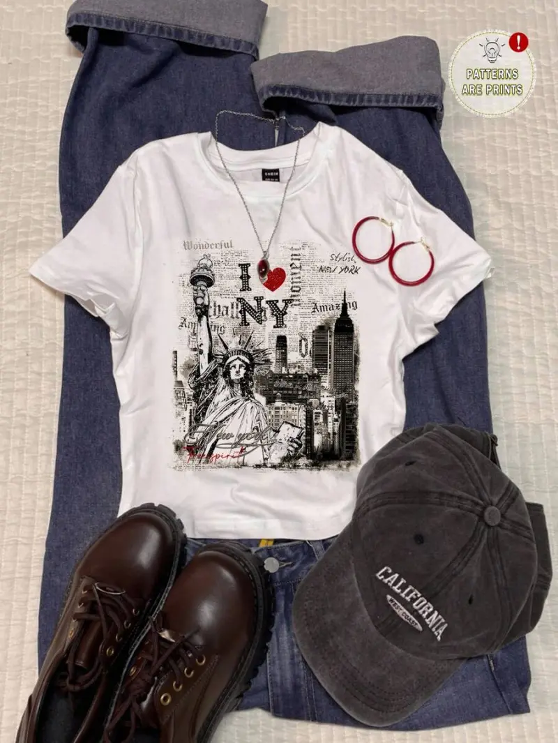 Vintage Style Casual "I Love NY" Letter Graphic, Statue Of Liberty & New York Scenery Print, Fitted Round Neck Short Sleeve T-Shirt For Women, Suitable For Summer, Vintage, Versatile, Sexy, Cute, Music Festival, Suitable For Autumn/Winter