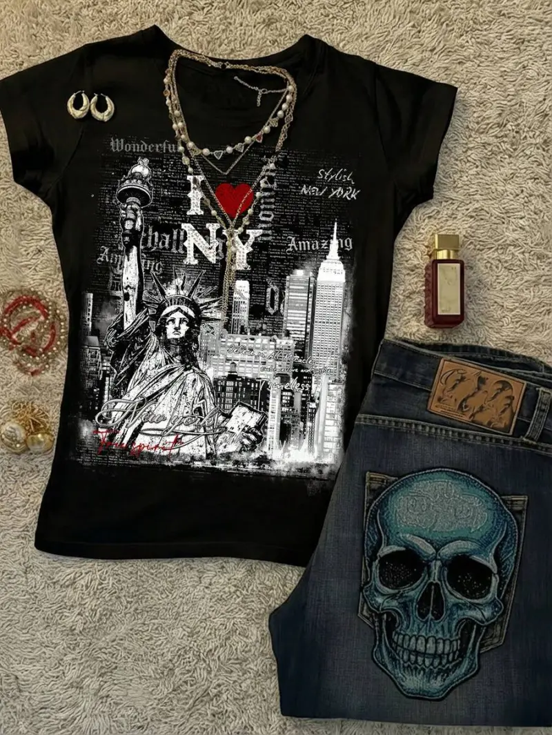 5. Vintage Style Casual "I Love NY" Letter Graphic, Statue Of Liberty & New York Scenery Print, Fitted Round Neck Short Sleeve T-Shirt For Women, Suitable For Summer, Vintage, Versatile, Sexy, Cute, Music Festival, Suitable For Autumn/Winter