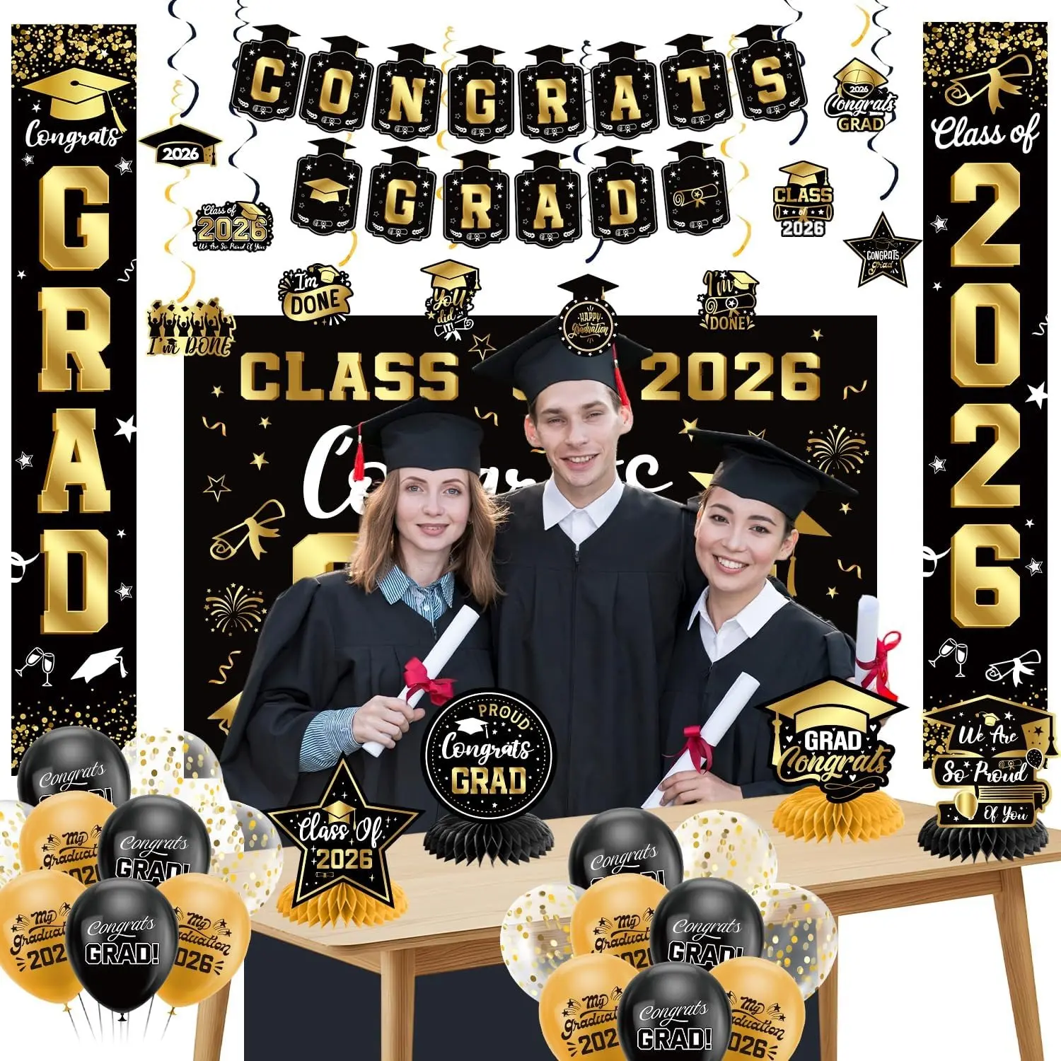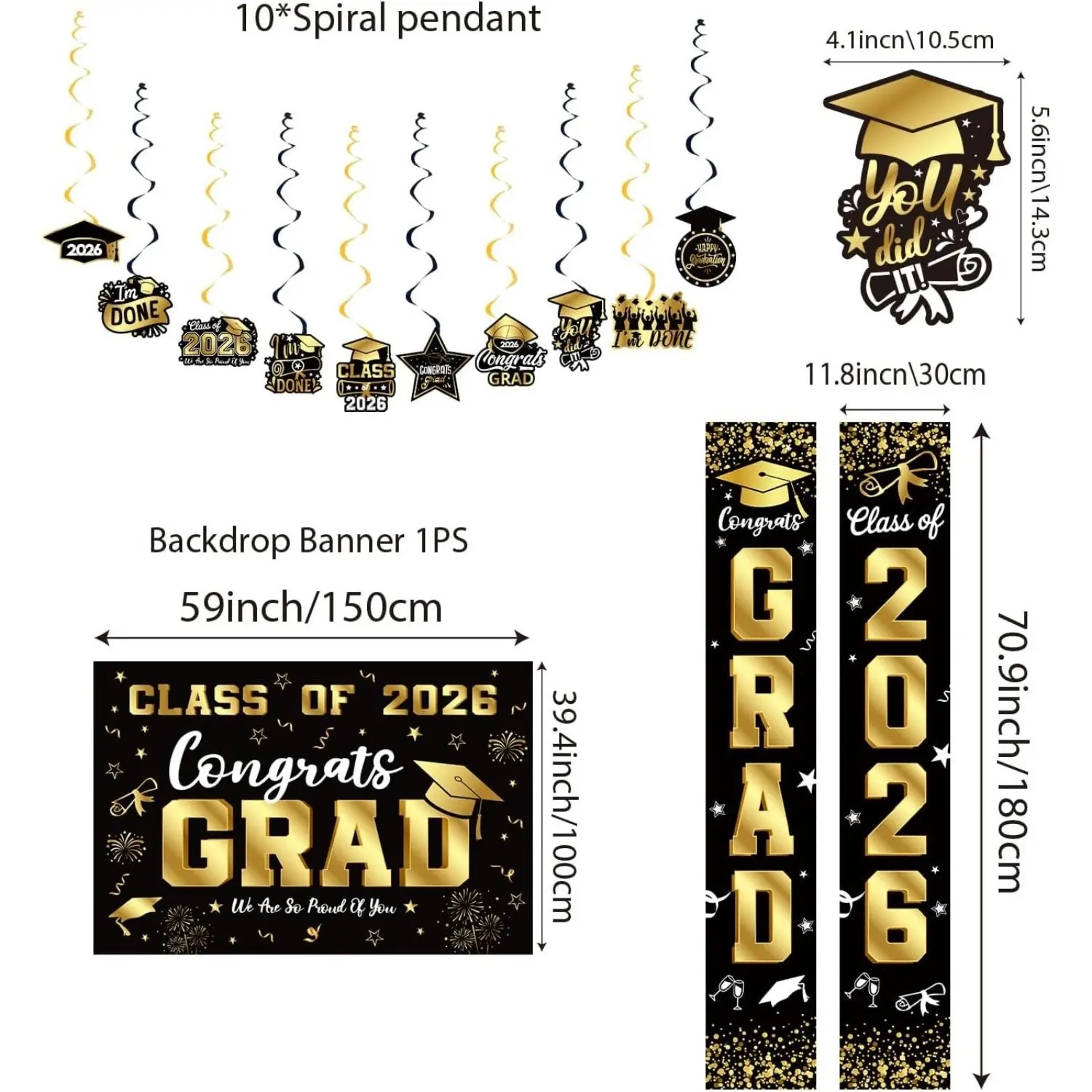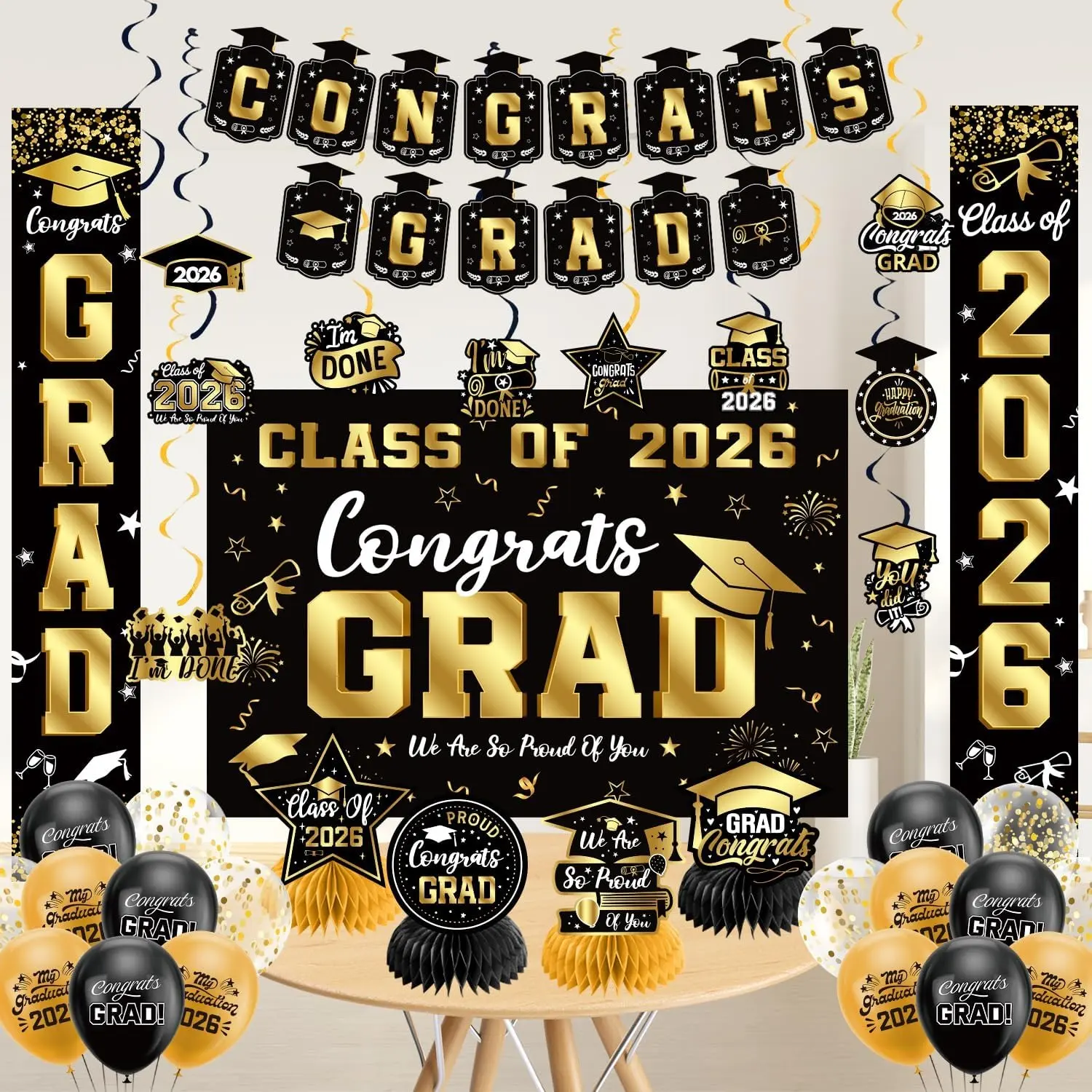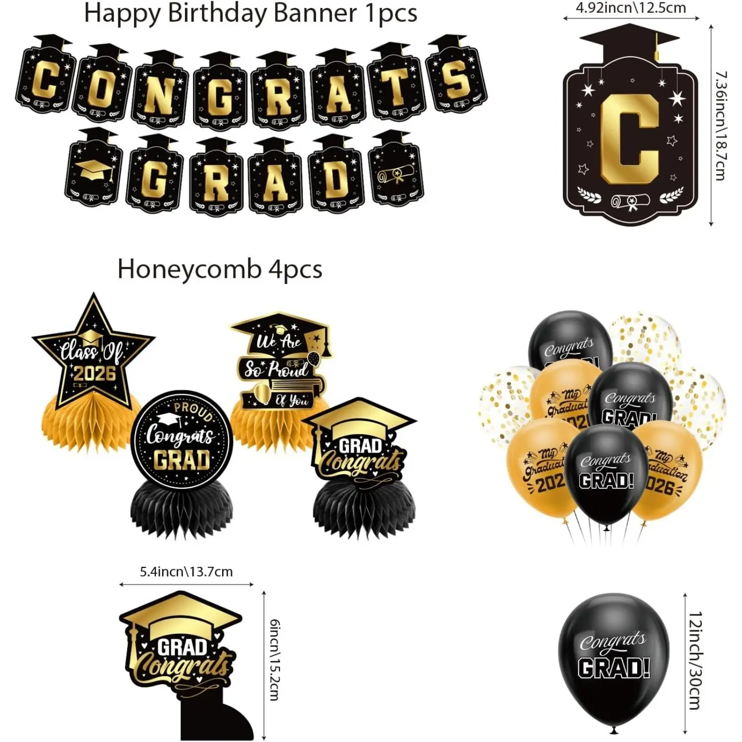 ·2026 Graduation Package: Our 2026 graduation decorations kit includes 1pcs "CONGRATS GRAD" banner, 1pcs class of 2026 Backdrop, 1pcs Porch Door Sign Welcome Banner, 4pcs Honeycomb Centerpieces, 10pcs cards hanging swirls, and 18pcs balloons, these are enough to decorate your graduation party, you don't have to spend any other time looking for different decorations