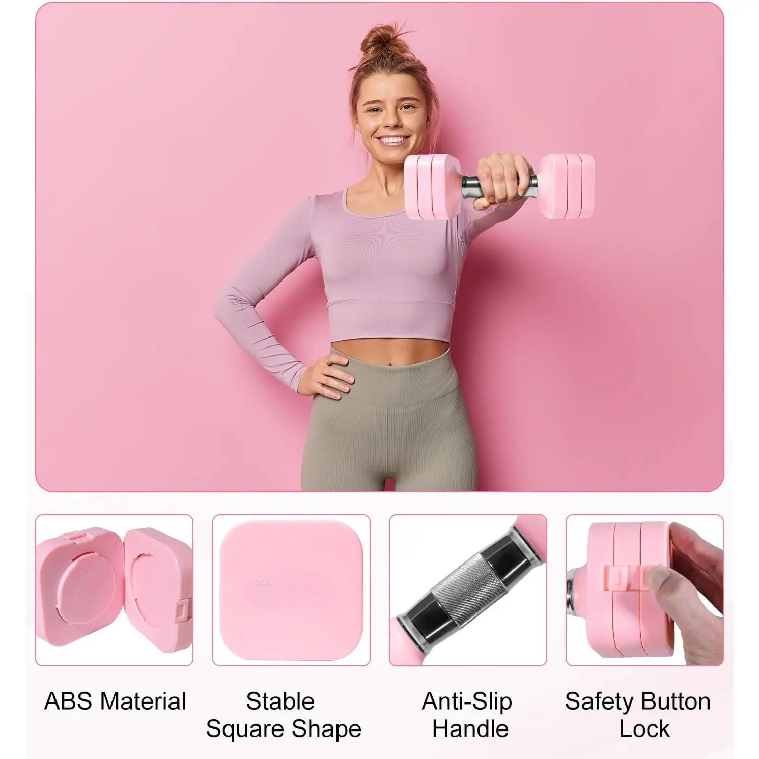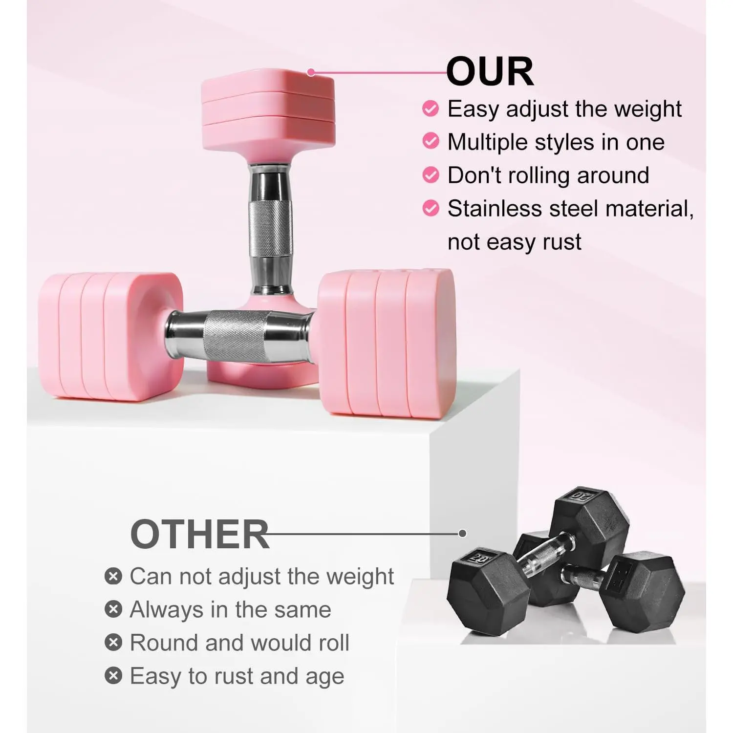 The dumbbells set of 2 are square and not round.The square shape keeps them from rolling around on the floor or shelf.The handle boasts anti-slip strips to provide better gripping.