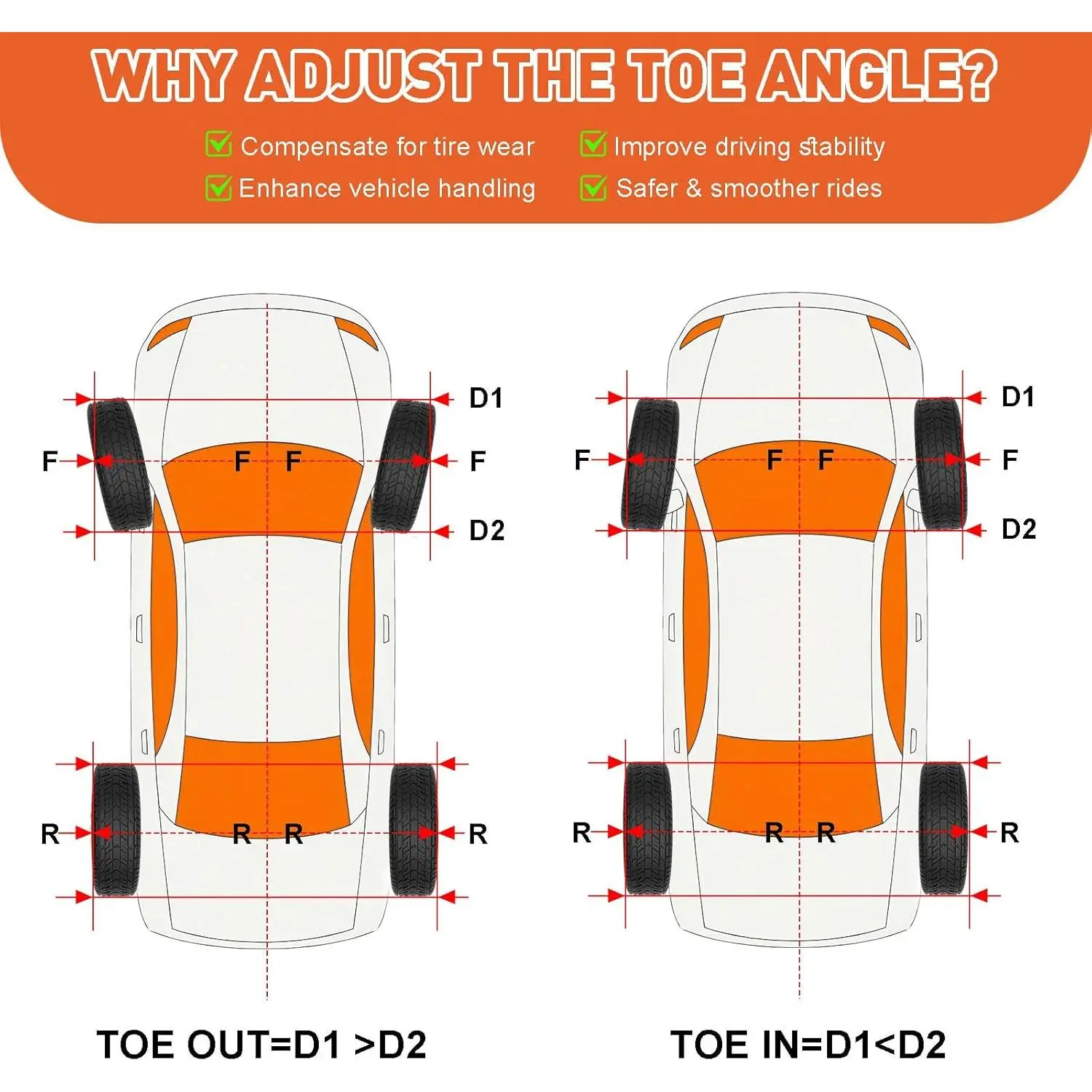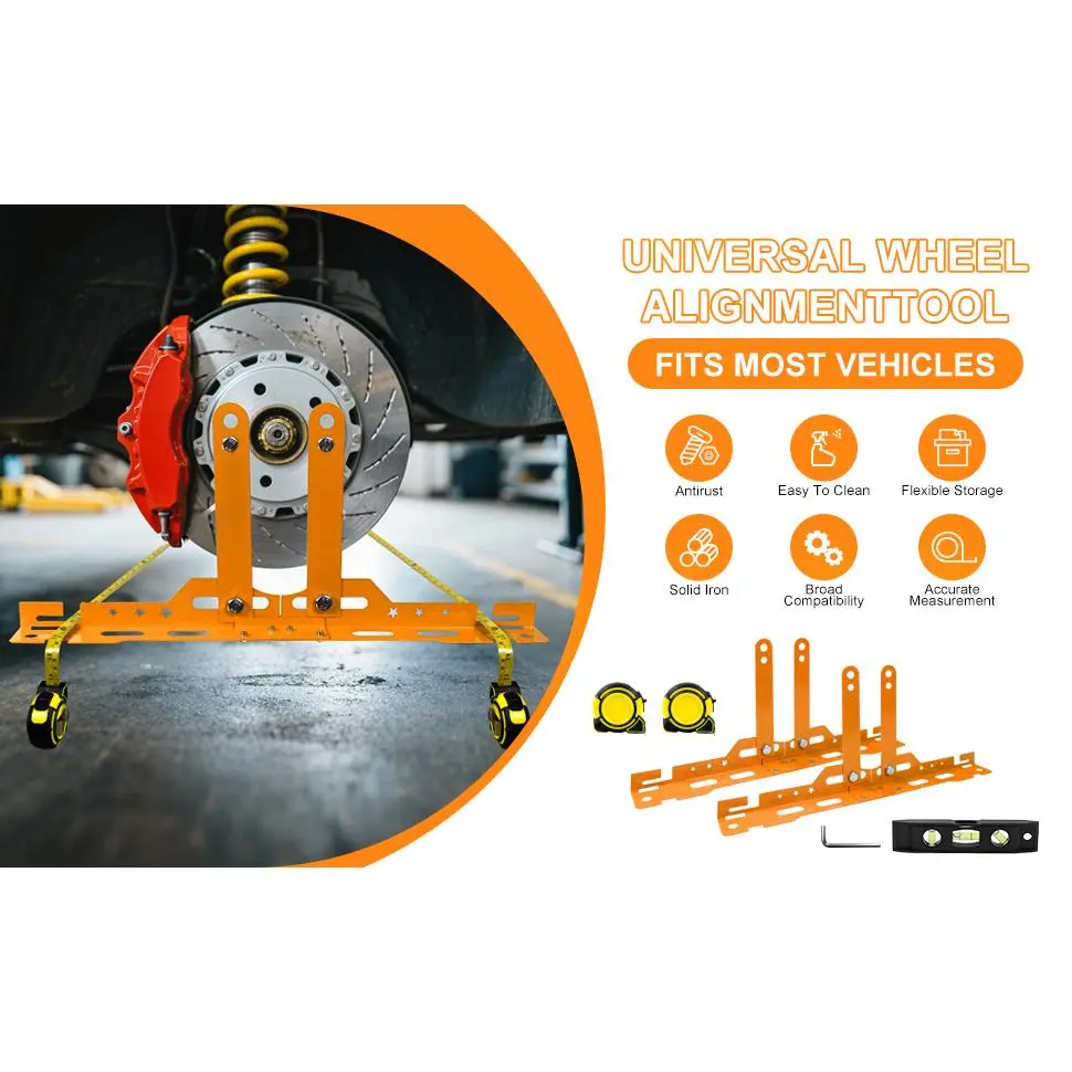 🔧[Quick Toe Adjustments – No Caliper Removal Needed] This wheel alignment tool set allows you to perform precise toe alignment without removing brake calipers-saving time and effort in your garage or shop.A must-have car alignment tool kit for DIYers and pros alike.🧰[Heavy-Duty Plates with Dual Measuring Tapes] The wheel alignment kit includes two toe plates crafted from solid iron with anti-rust coating , , plus two durable measuring tapes (imperial units).Accurately measure wheel toe and check for toe-in/toe-out at home or on the job🚘[Universal Fit for Most Vehicles] Whether you're adjusting the alignment on a car, truck, Jeep, or SUV, this toe alignment tool fits most 4-wheel vehicles.Ideal for use with lifted trucks, lowered cars, and off-road setups.📐[DIY-Friendly Alternative to Camber Gauge] Skip the expensive shop visits.With thistoe plates wheel alignment tool, you can check and correct wheel alignment at your convenience.Great for those who rotate their own tires or install new suspension parts.⚠️[Compact, Portable, and Easy to Store] The set includes 2 compact toe plates, 2 measuring tapes, and a bubble level – all easily stored in your garage or car trunk. A must-have alignment tools automotive set for road trips, off-roading, or daily maintenance.