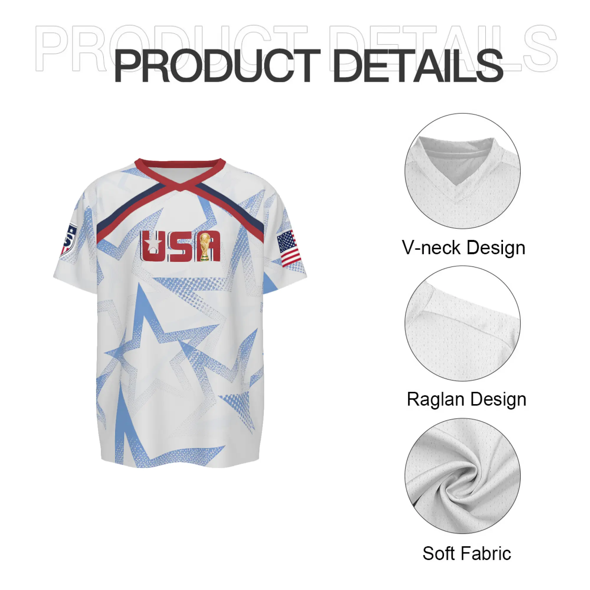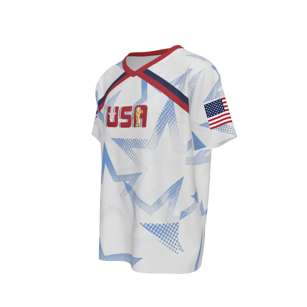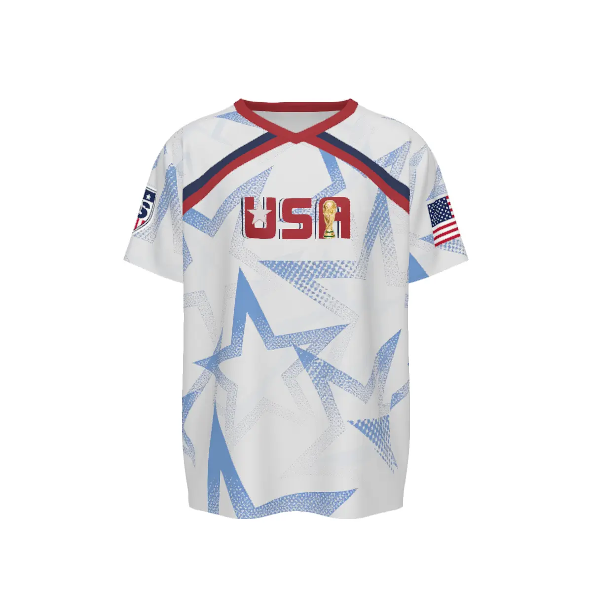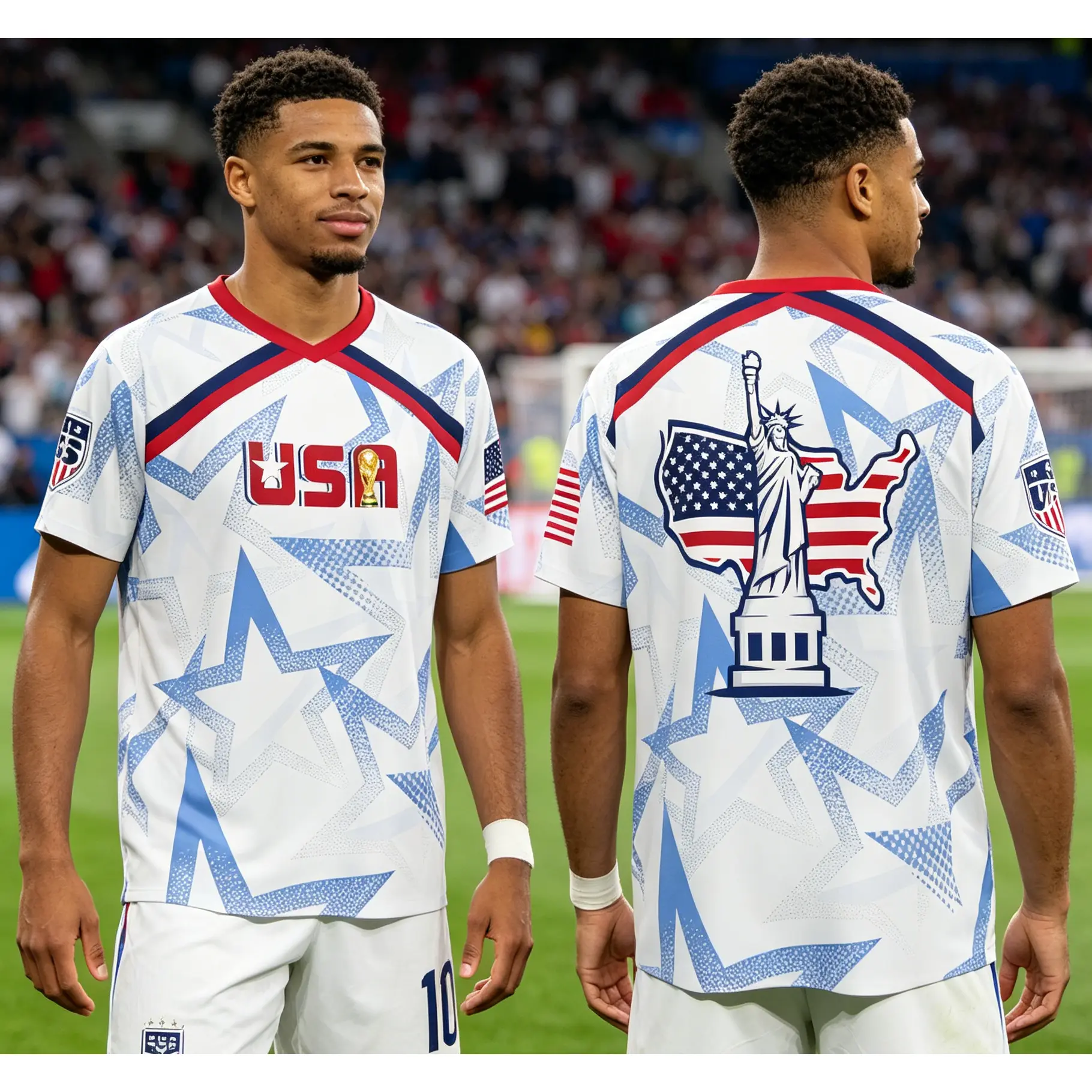 V-neck USA soccer jersey with Statue of Liberty & map graphics, designed for 2026 World Cup fans. Perfect gift for soccer lovers and players, ideal men’s patriotic soccer wear.