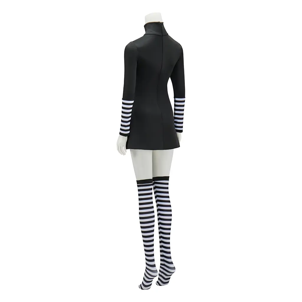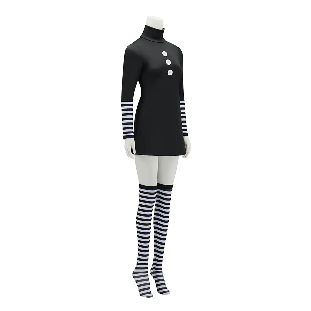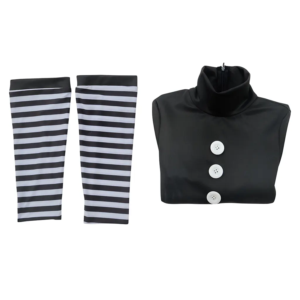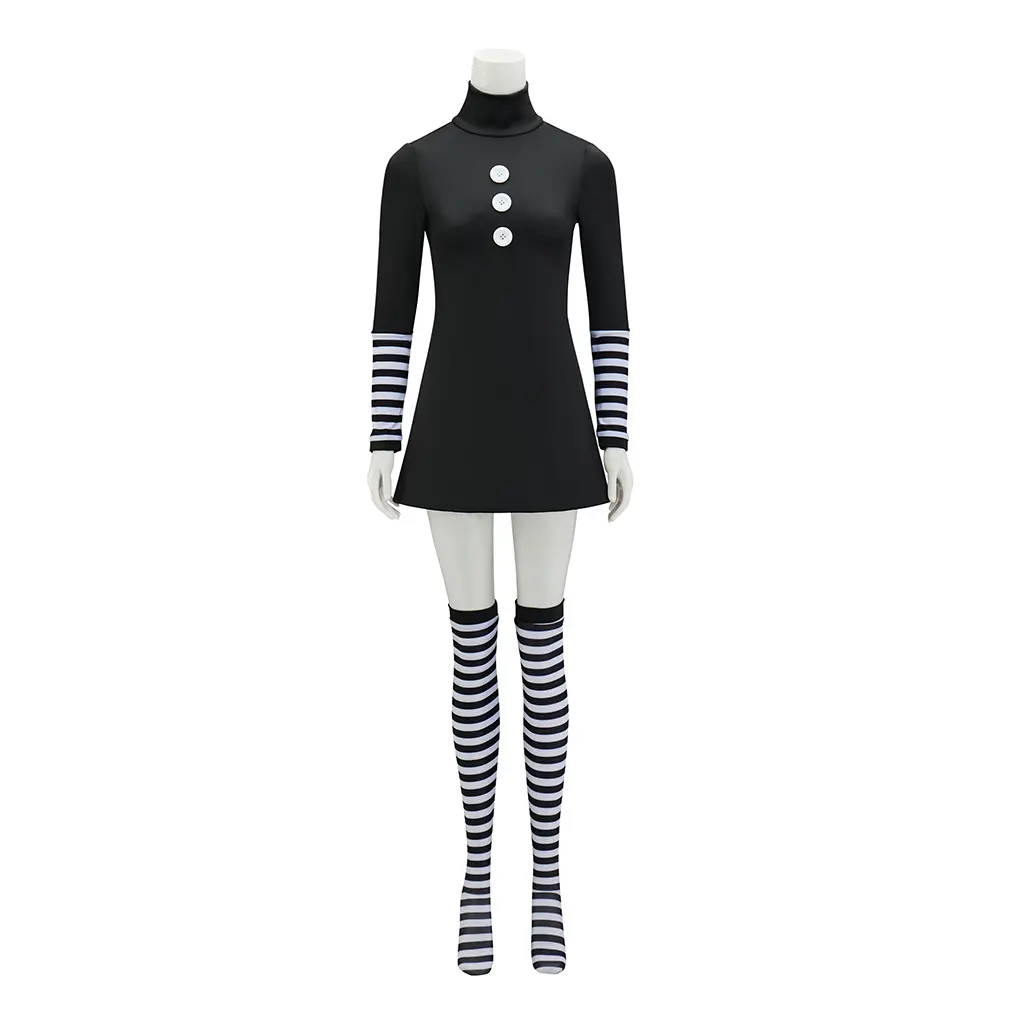 Unleash your eerie elegance with this Marionette Cosplay Costume, featuring a sophisticated black dress with signature puppet-inspired details.This chilling ensemble perfectly captures the uncanny beauty of a haunted marionette, complete with striped stockings for an authentic look.The flowing dress and theatrical design make it ideal for bringing this mysterious character to life at Halloween or conventions.