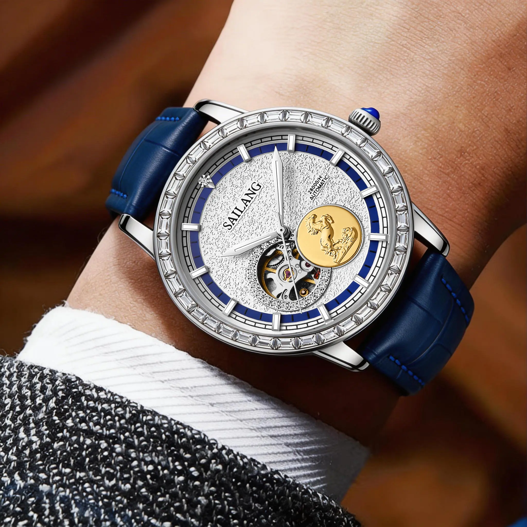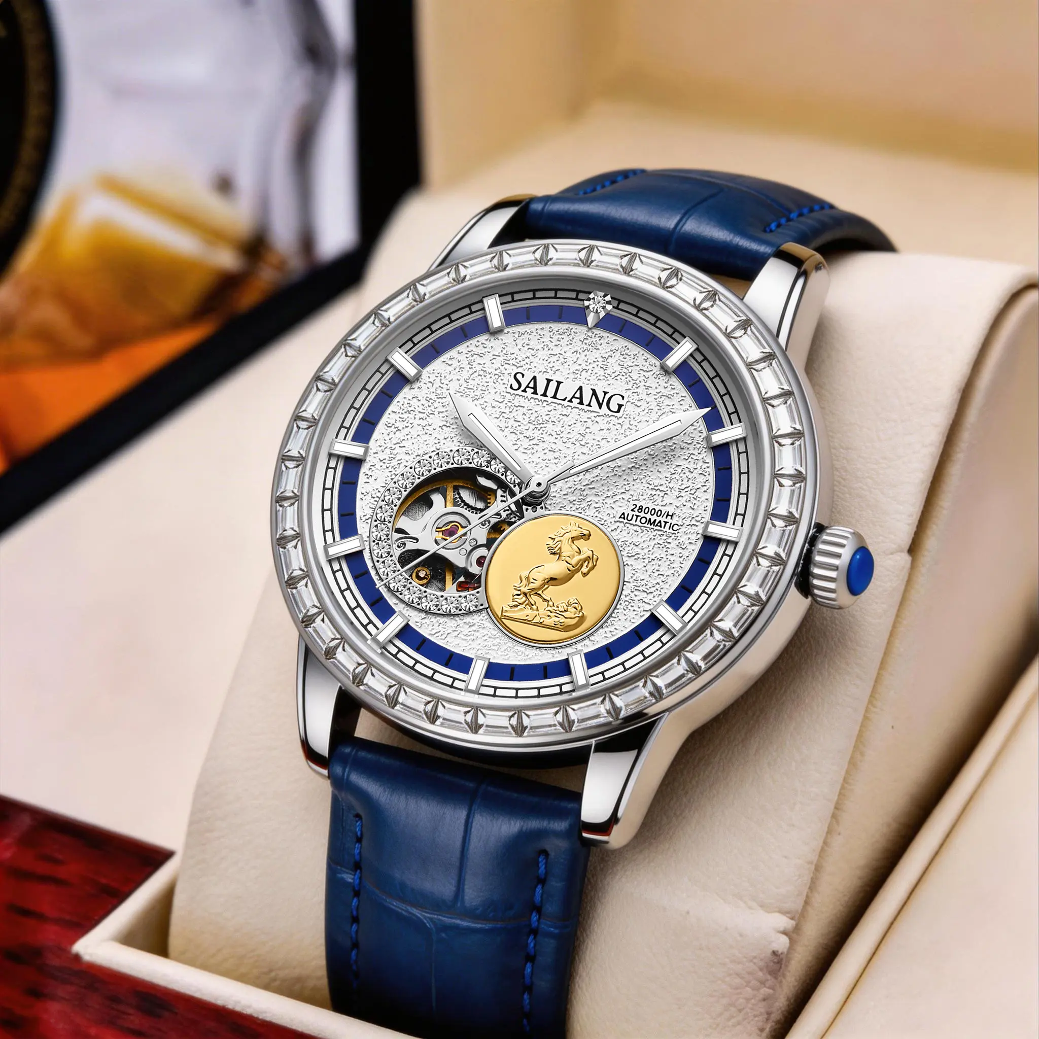SAILANG trendy choice Luxury Men's Automatic Mechanical Watch with Golden Horse Design Silver Business Casual Dress Watch Comfortable PU Leather Strap Waterproof Calf Skin Skeleton Dial