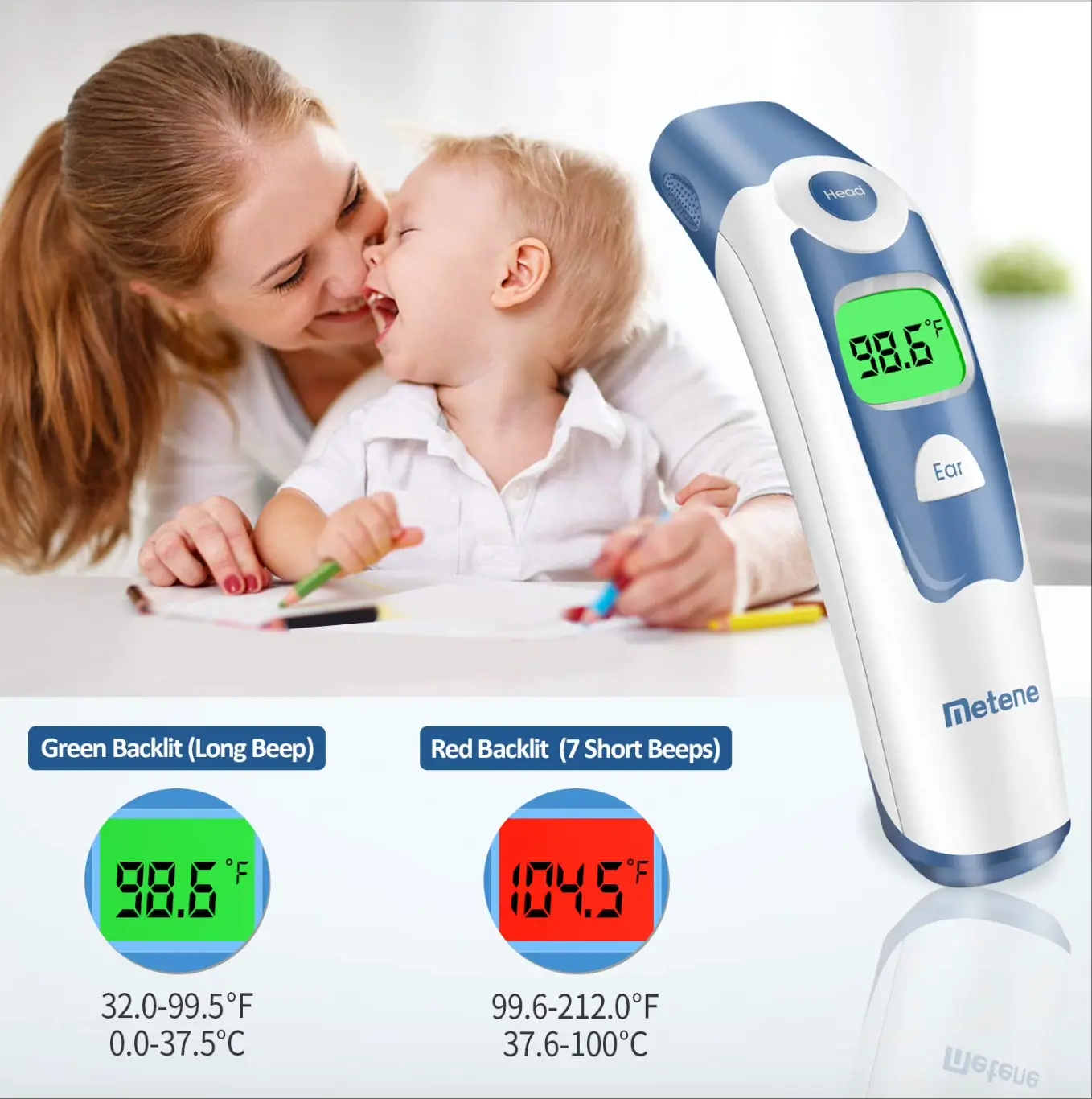 Metene Infrared Thermometer for Fever, Forehead and Ear Thermometer with Fever Indicator and Memory Function, Best Digital Temporal Infrared Thermometer, Professional Clinically Accuracy Babies, Infants