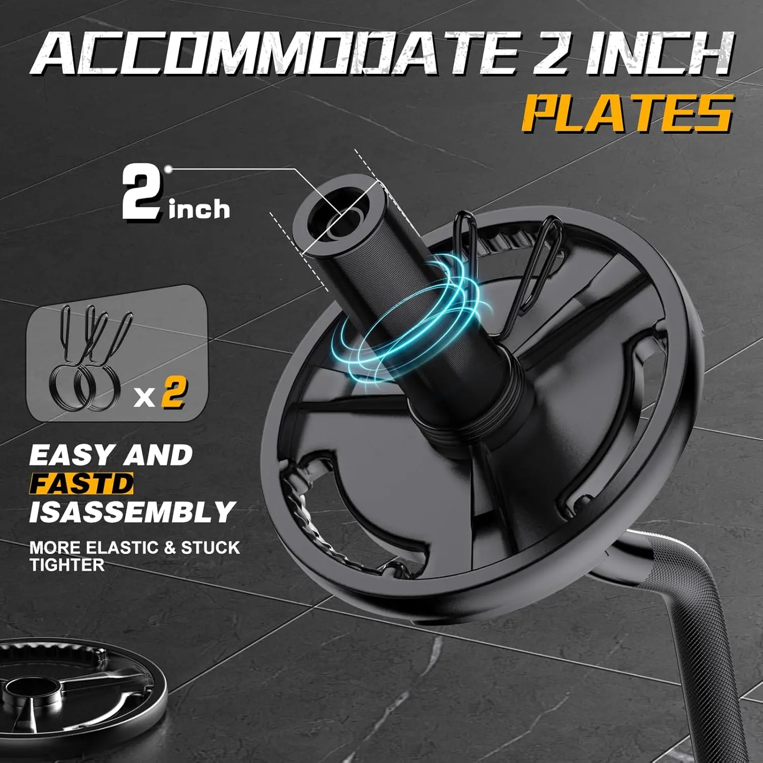 SPECS & 2 WARRANTY: The length of the olympic EZ bar is inches, Compatible with 2" Olympic boards.Two spring rings are provided for quick weight change.We offer a 2-year warranty unconditionally, and we are confident in the quality of our products, each of barbell curl bar is rigorously tested.