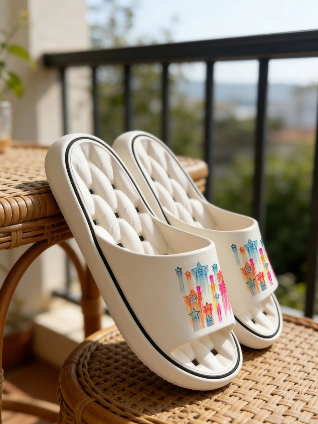 1 Pair Rainbow Shooting Star Themed Printed Hollow Massage Thick Sole Slippers, Sweet Cool Girl Style, Non-slip Soft Sole, Quick-dry for Bathroom, Indoor & Outdoor Dual-use, Open Toe Slides, Bathroom Casual Slippers