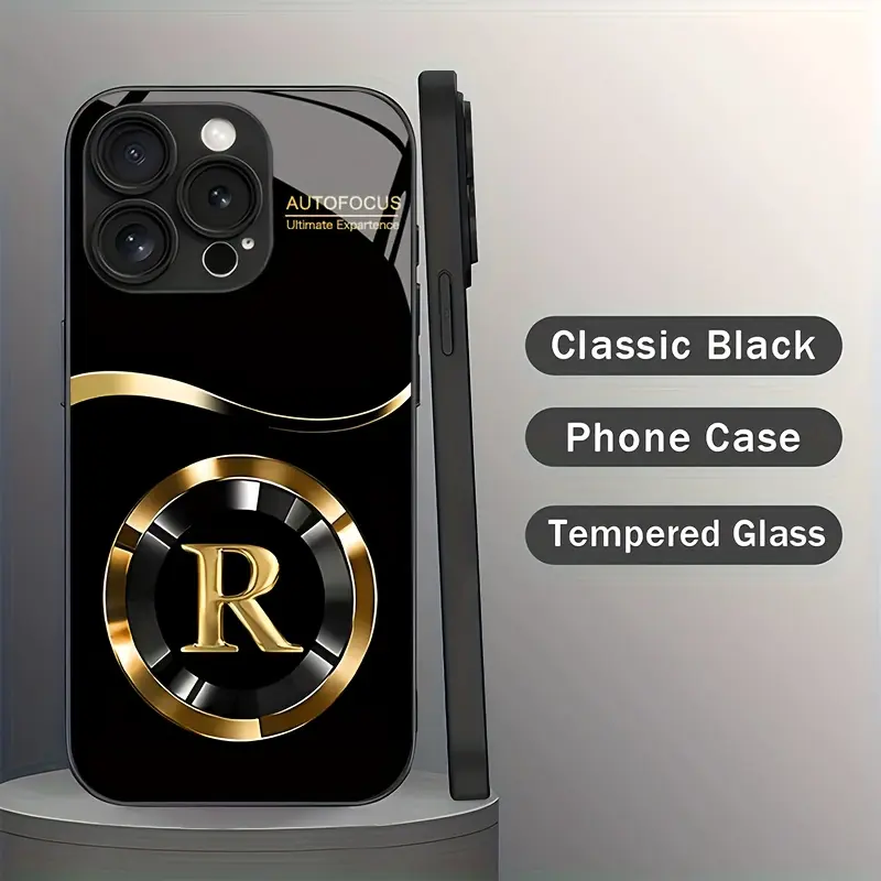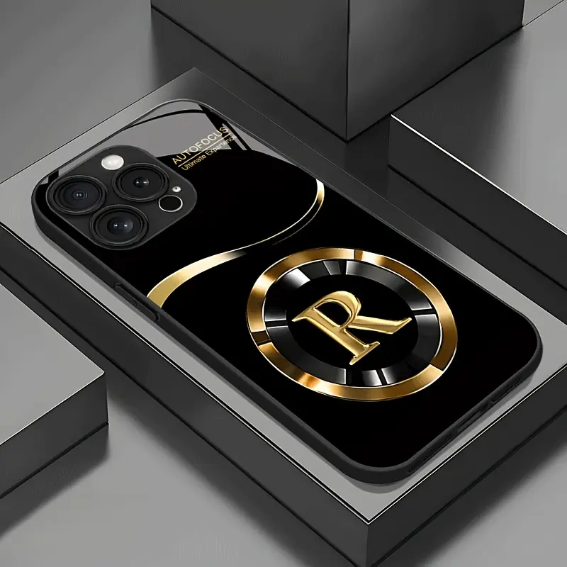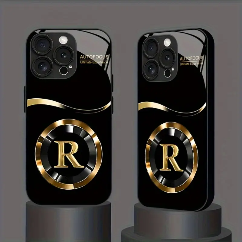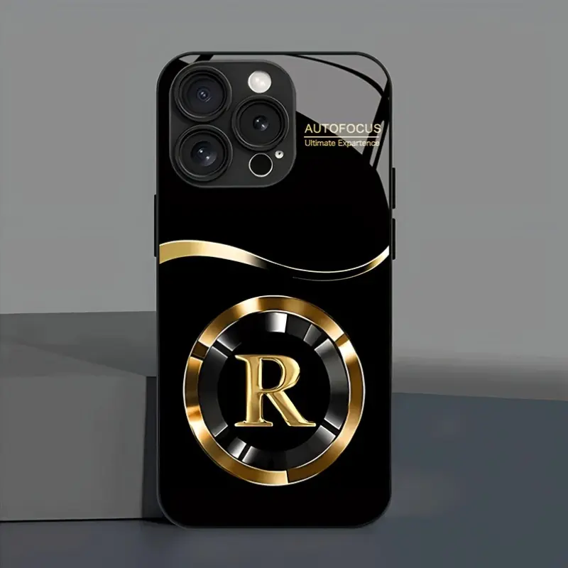 Simple golden lucky letter R pattern glass phone case, for iPhone 17 16 15 14 13 12 11 pro max