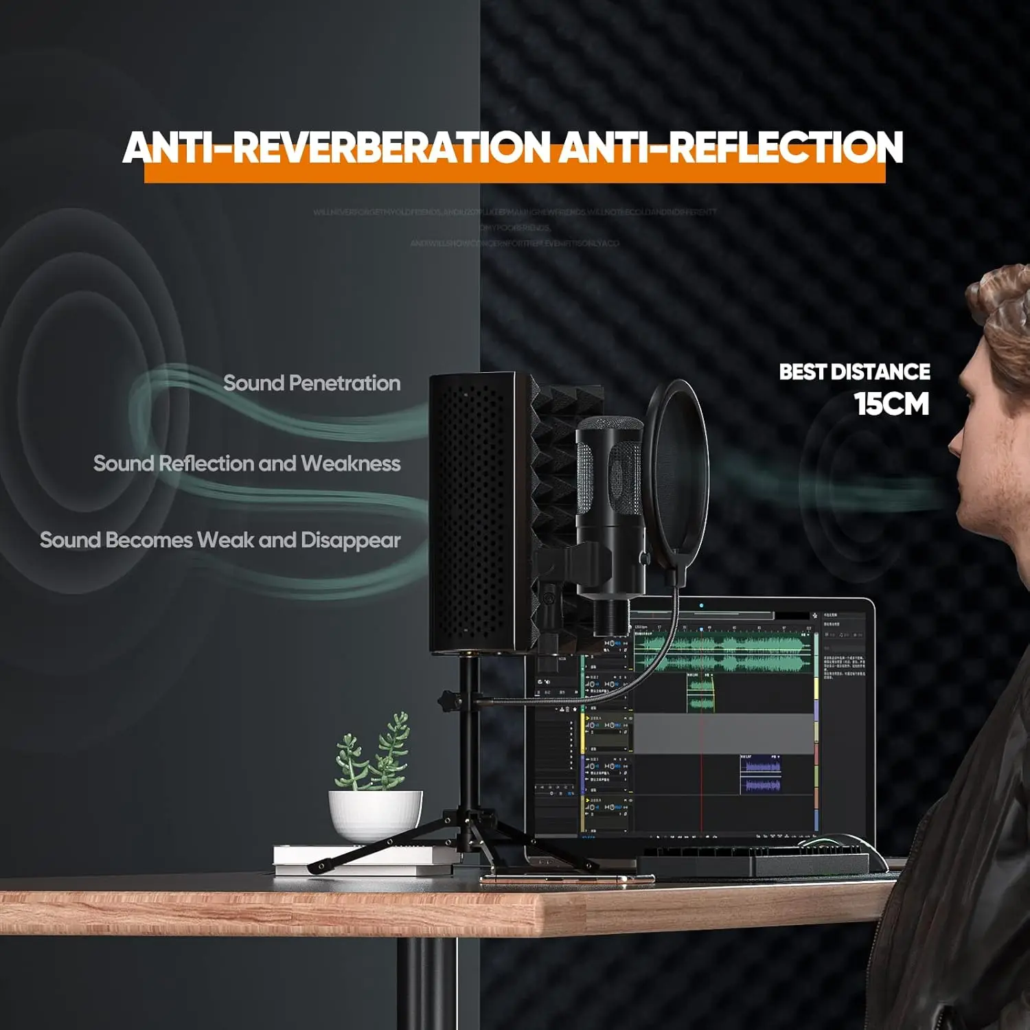 PORTABLE AND FOLDABLE MICROPHONE SHIELD: This 3-panel isolation shield is composed of a reflective layer, filter layer, absorbing layer, and high-quality screws, which are durable.The inner layer is composed of high-density absorbent , which can absorb environmental noise and reduce sound reflection when recording sound, providing excellent studio microphone music recording effects.The compact and foldable panel design can be adjusted to suit the angle you want, making it easy to carry.