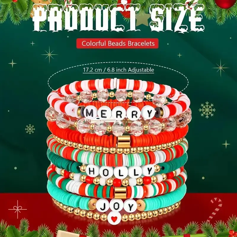 MANY [Christmas Holiday Bracelet Set] 10-Pack Festive Polymer Clay Heishi Stretch Bracelets with Joyful Messages Plastic Bead Jewelry Gift for Women Seasonal Party Accessories.