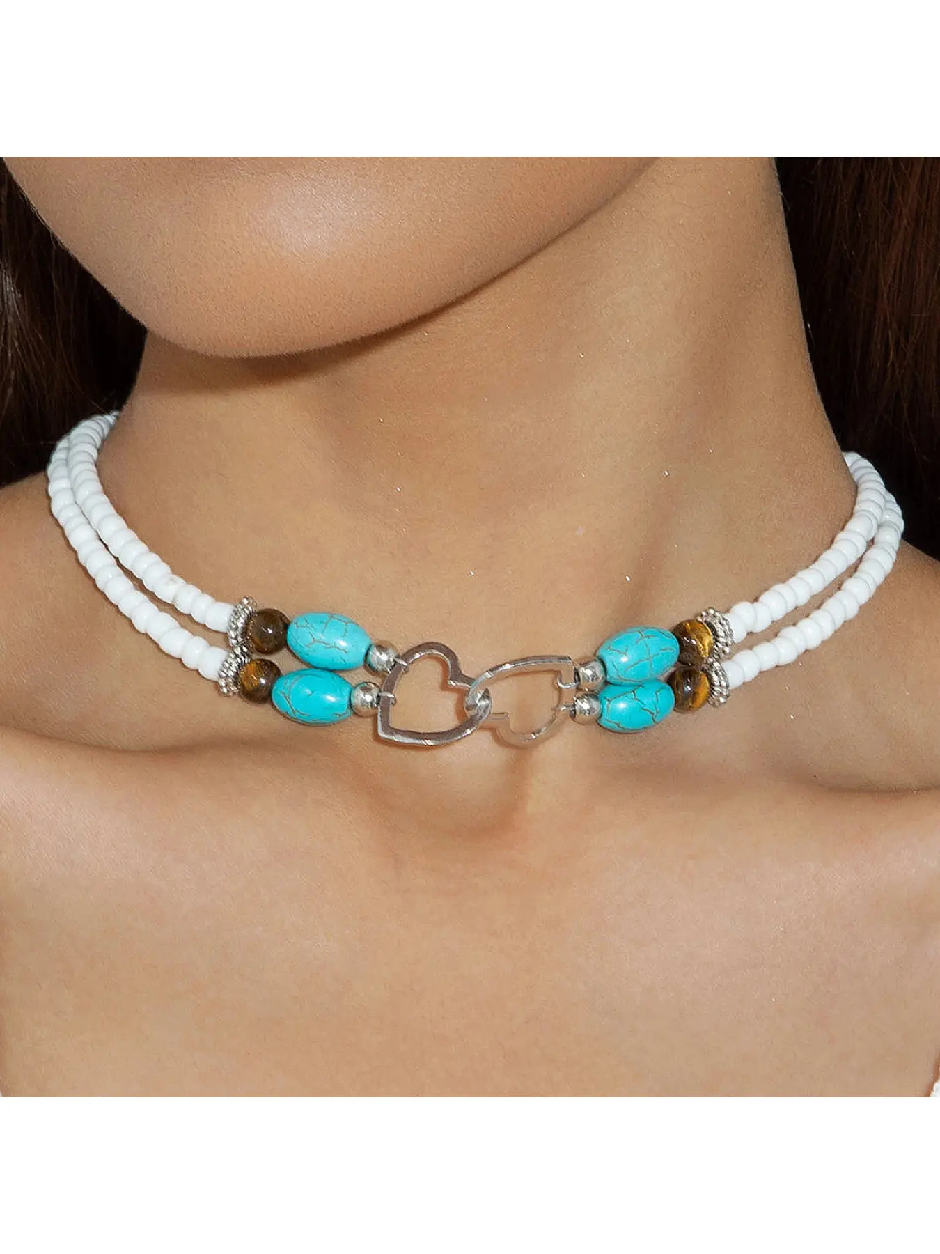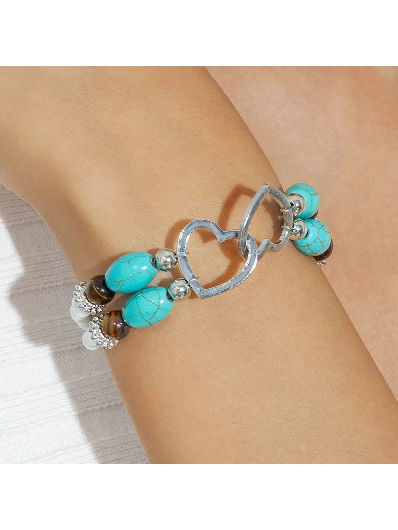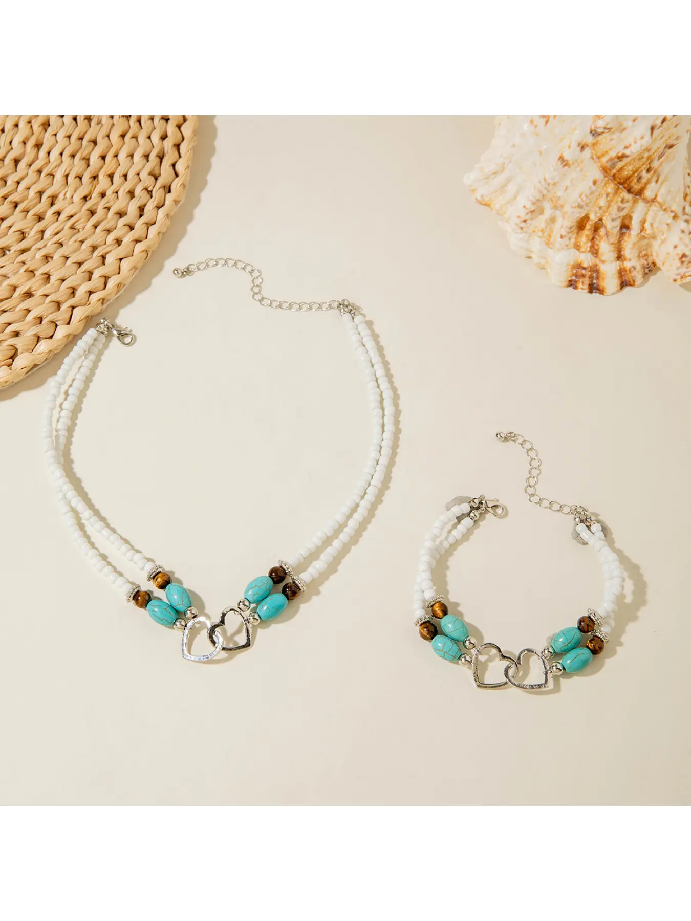 Boho Vacation Style Beaded Turquoise Jewelry Set, Metal Heart Jewelry, Elegant Accessories for Women, Perfect Gift Idea
