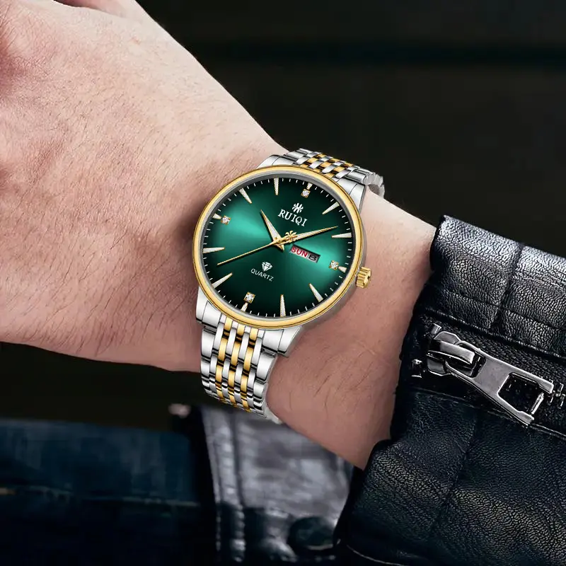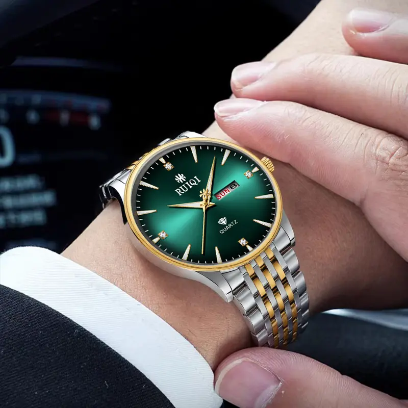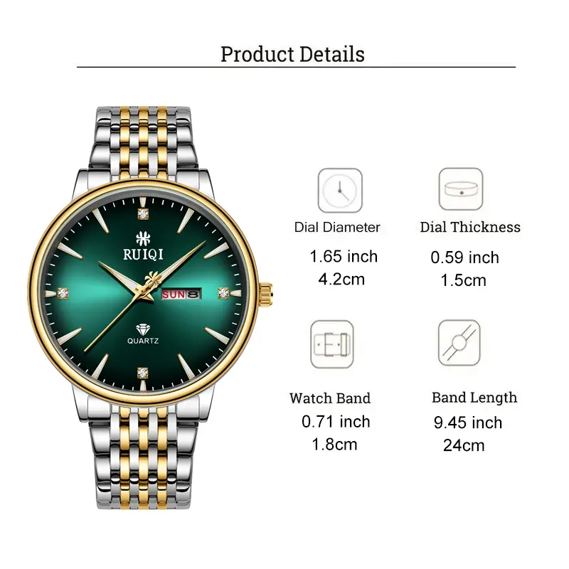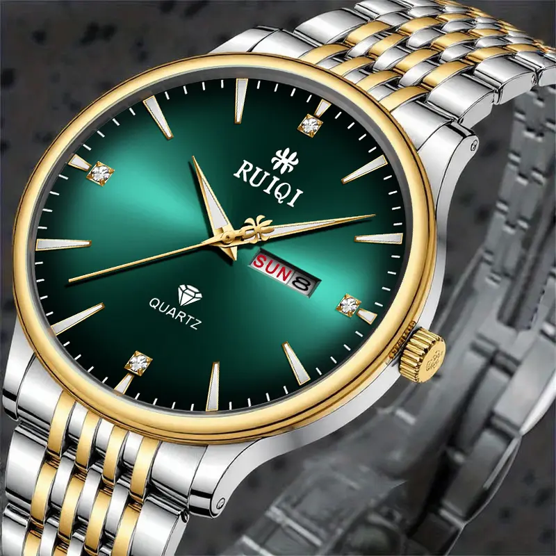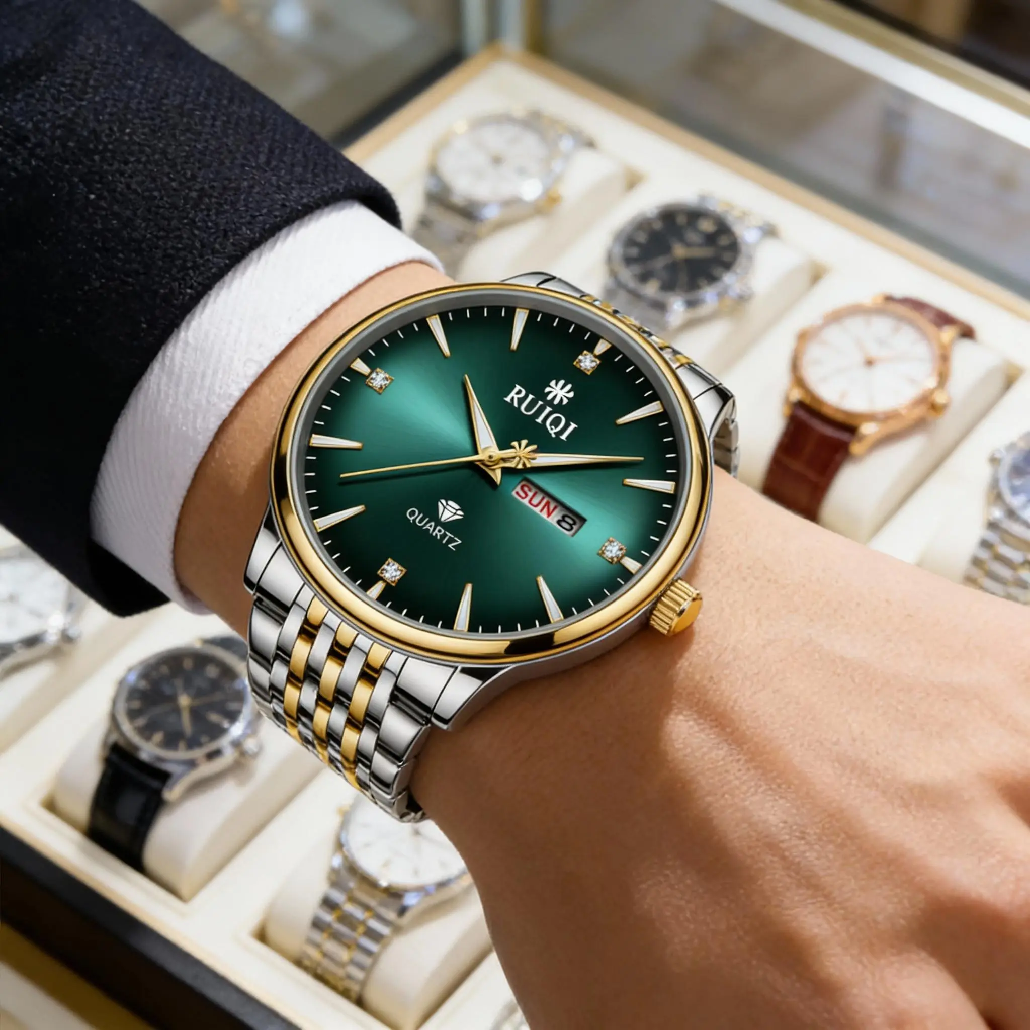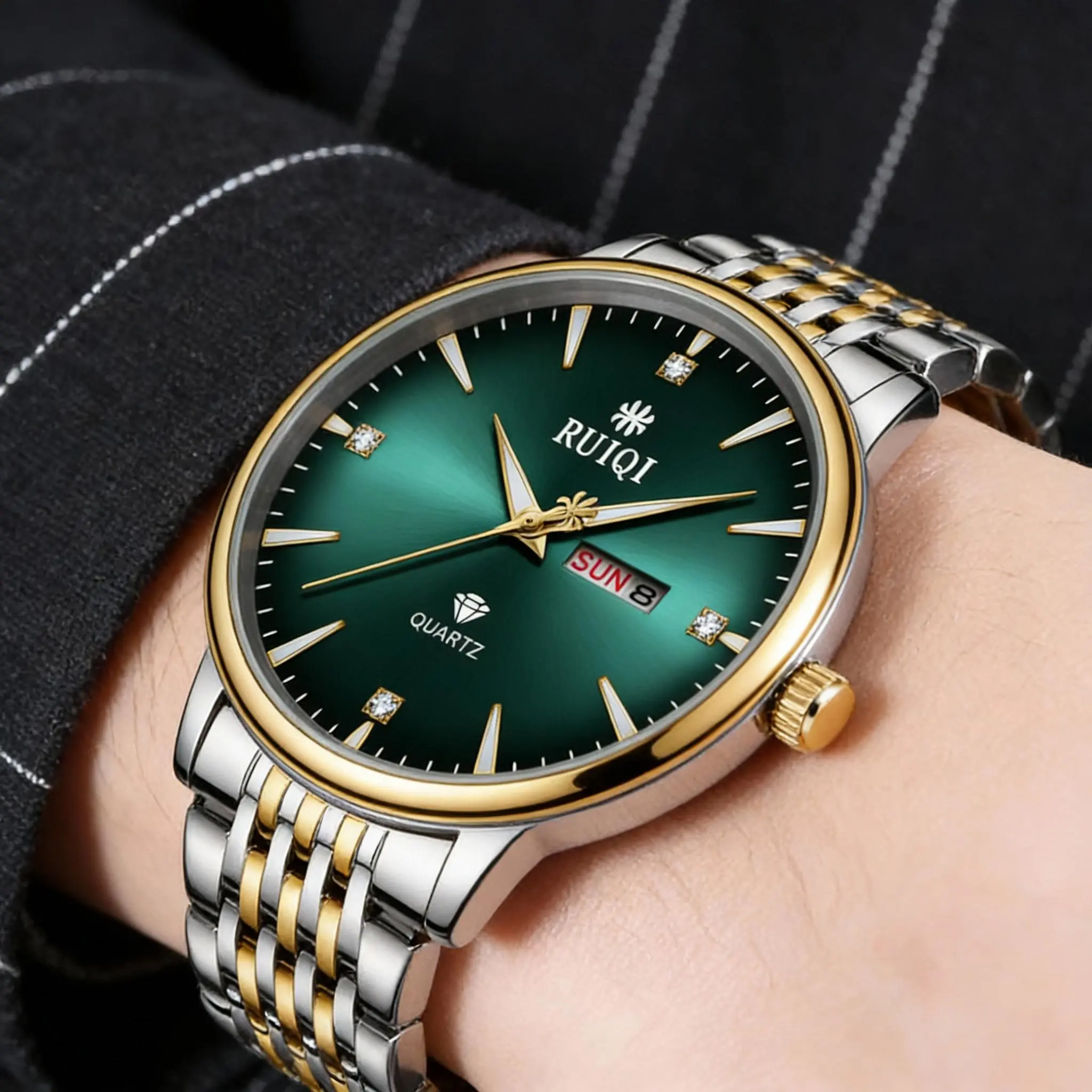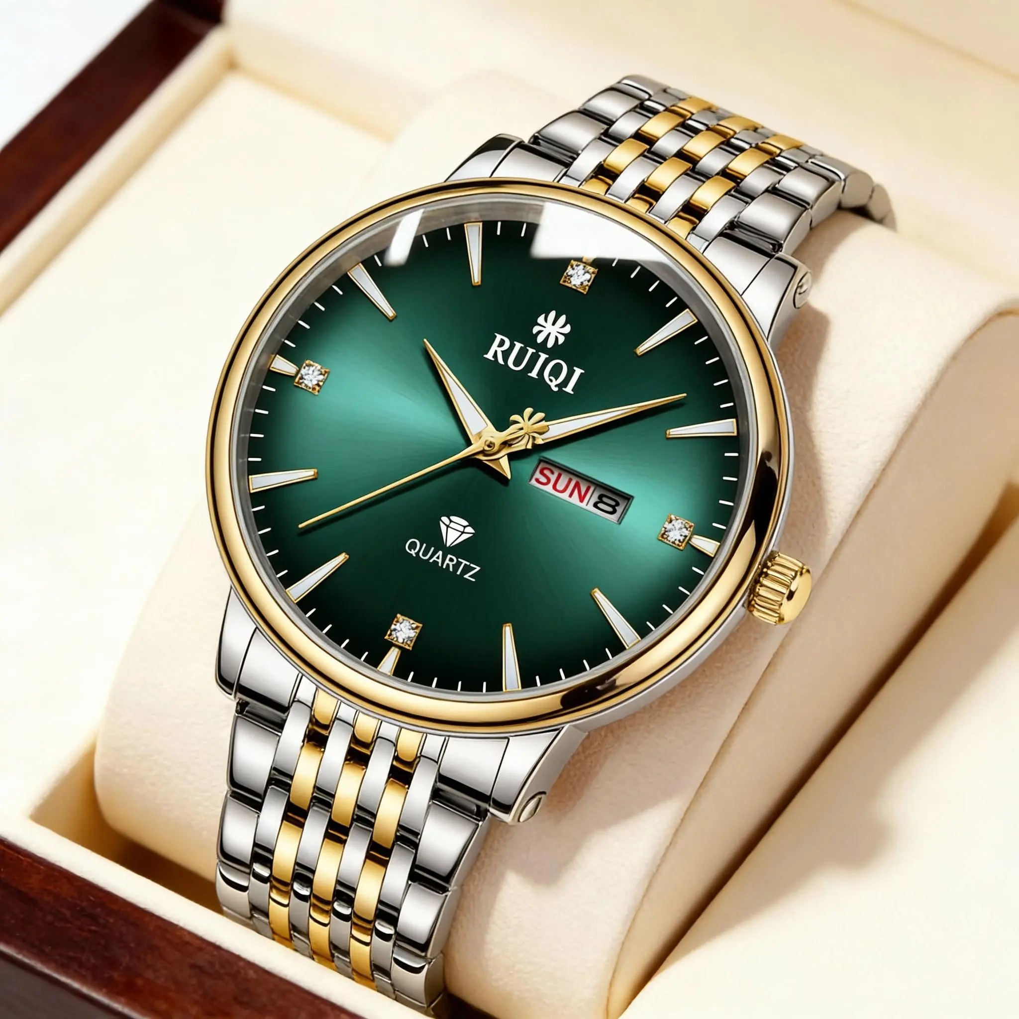 RUIQI business casual Men's Quartz Watch with Dark Green Dial Diamond Hour Markers Luminous Hands Adjustable Stainless Steel Strap Waterproof Dress Wristwatch for Formal Occasions