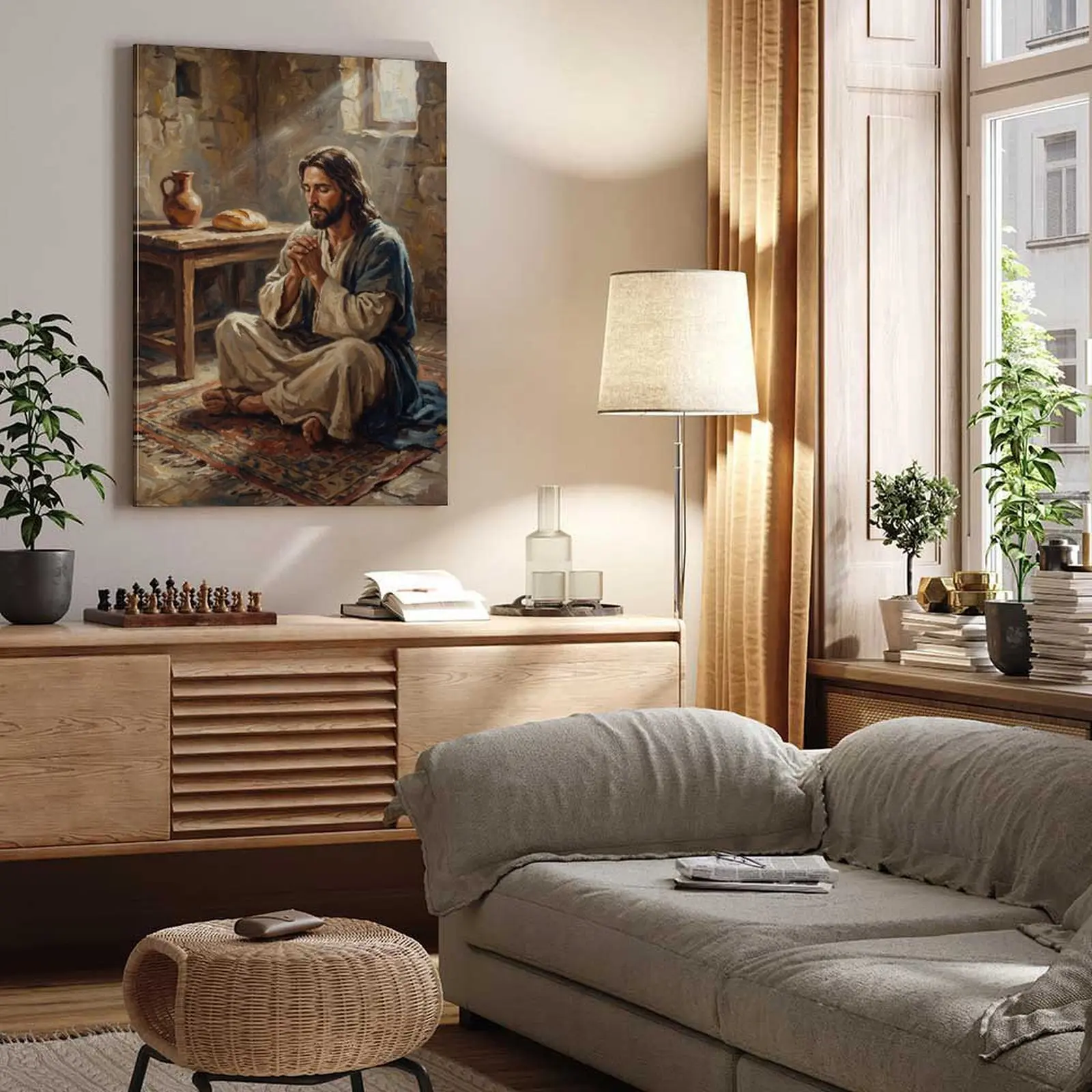 ·This rustic Christian canvas wall art features Jesus in humble prayer. Perfect for religious home decor, it adds a serene touch to your living room. The print captures Jesus in solitude, evoking a sense of peace and reflection. Ideal for those seeking spiritual ambiance in their space.