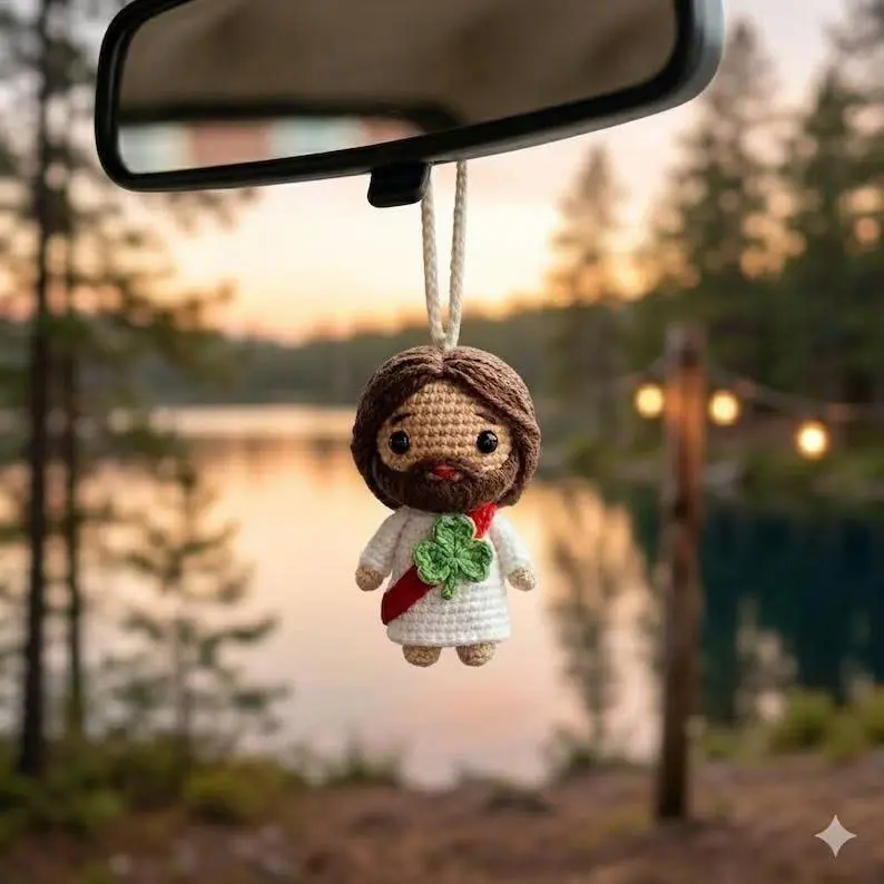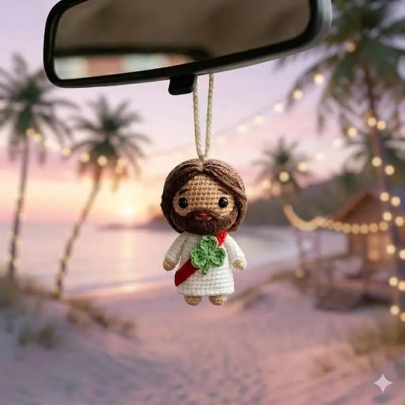 Crochet Jesus Car Hanging, Jesus Amigurumi Car Charm, Religious Rear Mirror Decor, Christian Gift, Lucky Clover Car Ornament