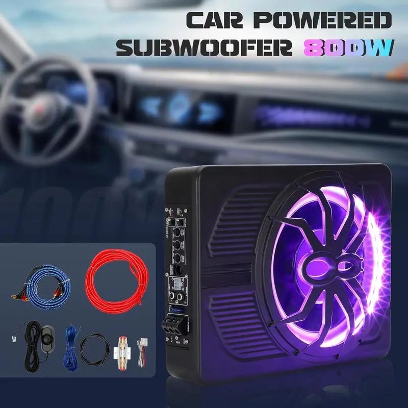 This subwoofer is portable and easy to install.It comes with a car amplifier wiring kit for connecting wires and powering audio systems.The seven-color lights, including blue LED lights, illuminate when the car starts.Adjust light color and frequency via the app using Bluetooth connectivity.