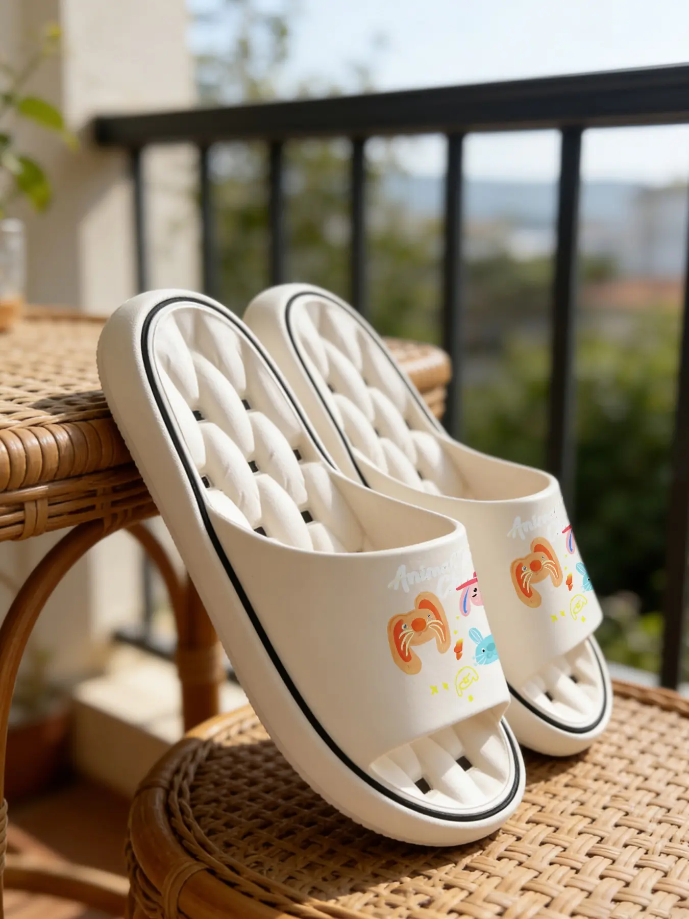 1 Pair Cartoon Animal Letter Printed Hollow Massage Thick Sole Slippers, Cute Healing Style, Non-slip Soft Sole, Quick-dry for Bathroom, Indoor & Outdoor Dual-use, Open Toe Slides, Bathroom Casual Slippers