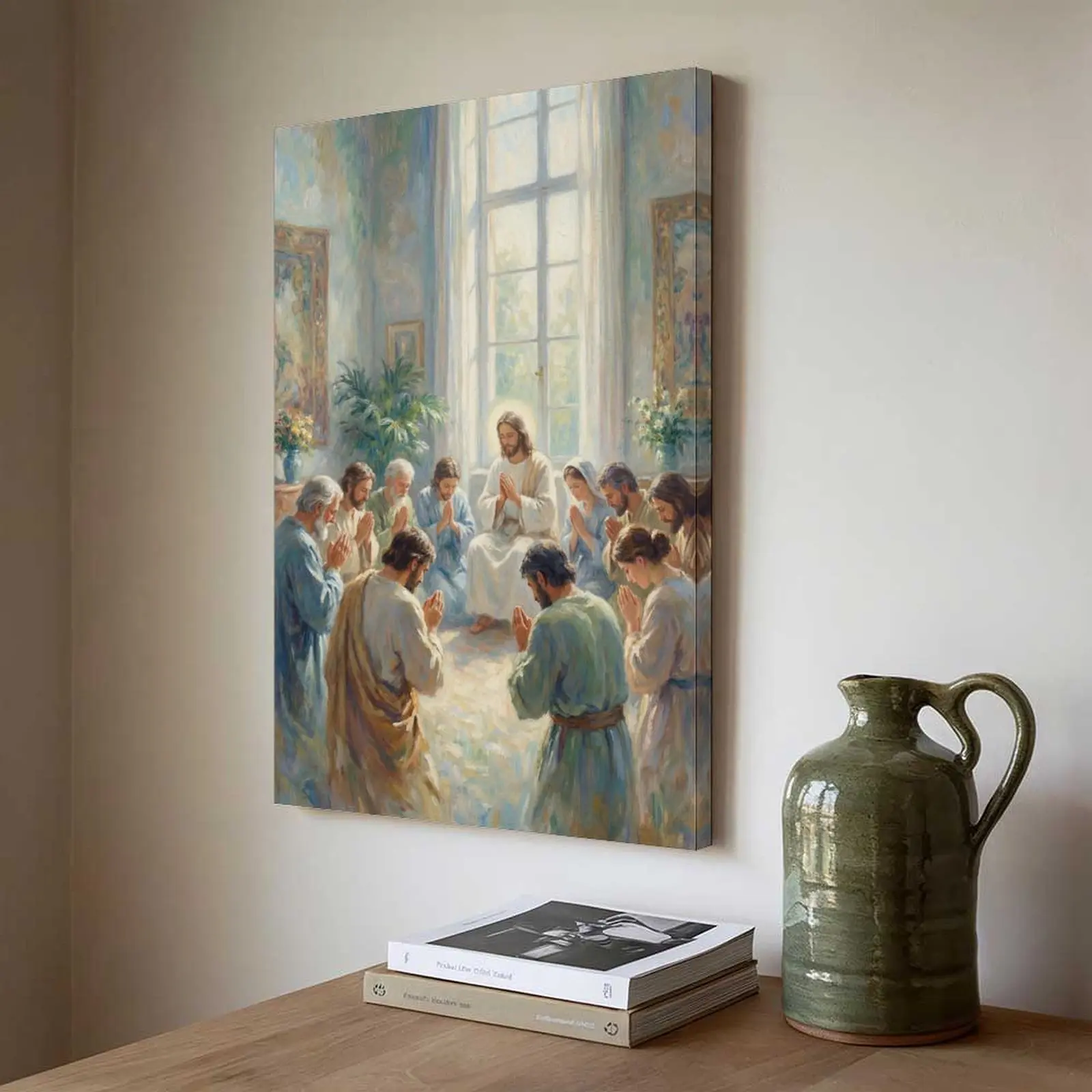 This canvas art is perfect for Christian homes. It features a serene depiction of Jesus and the Apostles in prayer, ideal for religious wall decor. The artwork brings a spiritual ambiance to any room. Hang it to inspire and uplift your space.