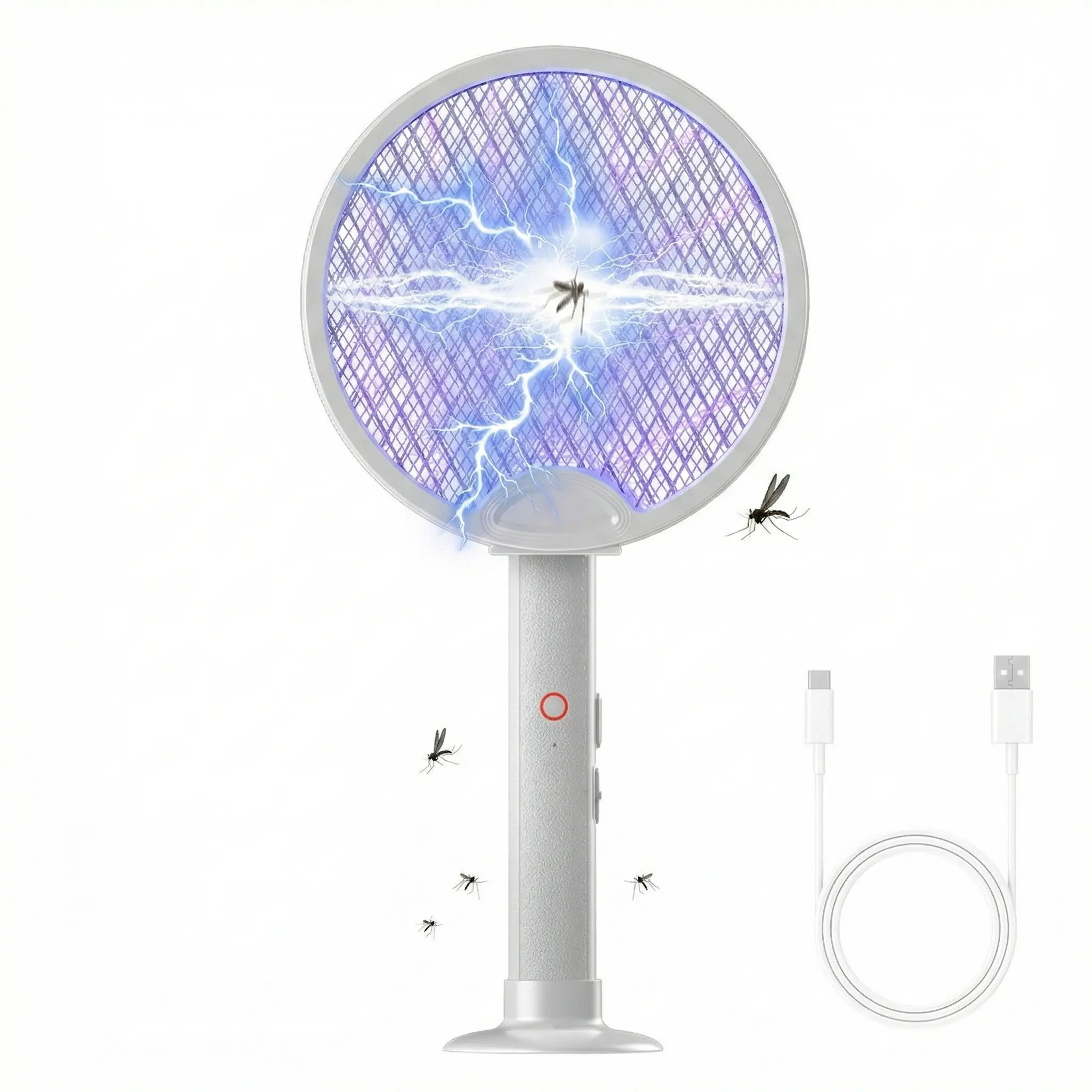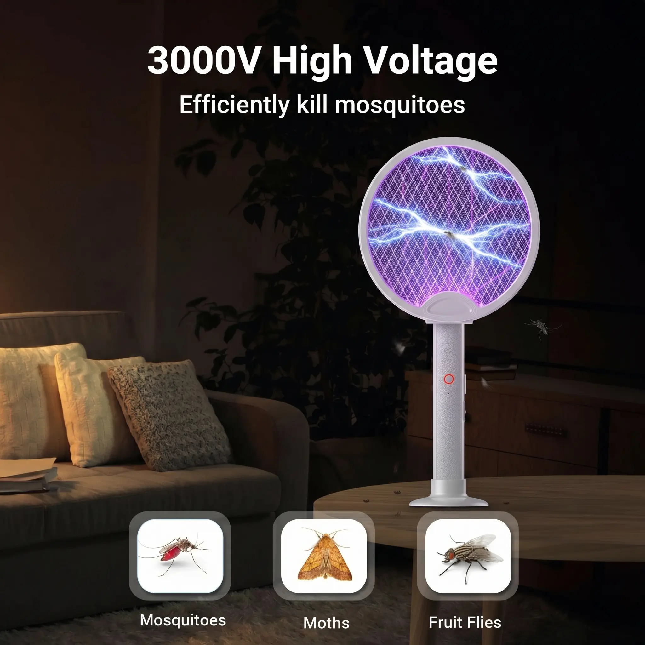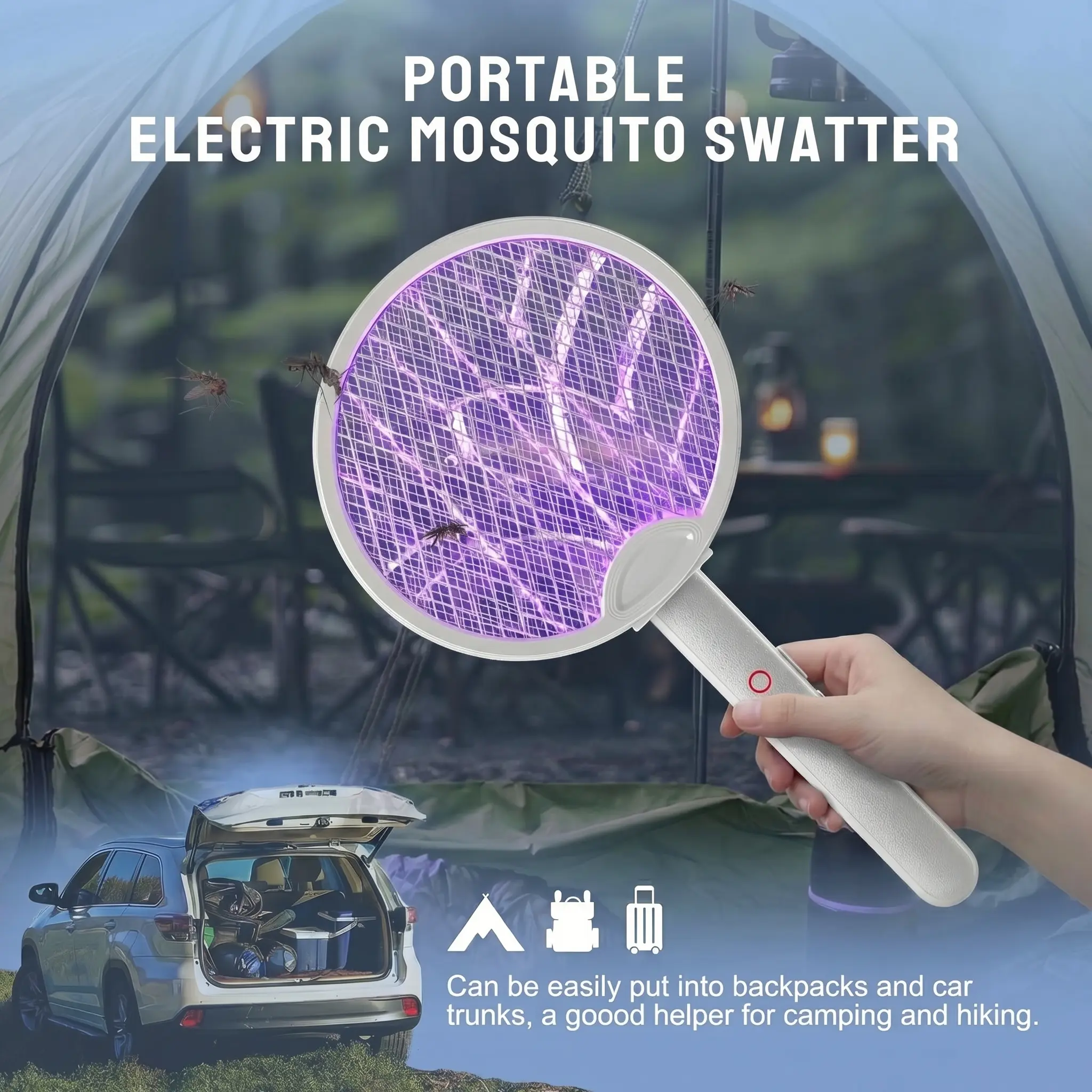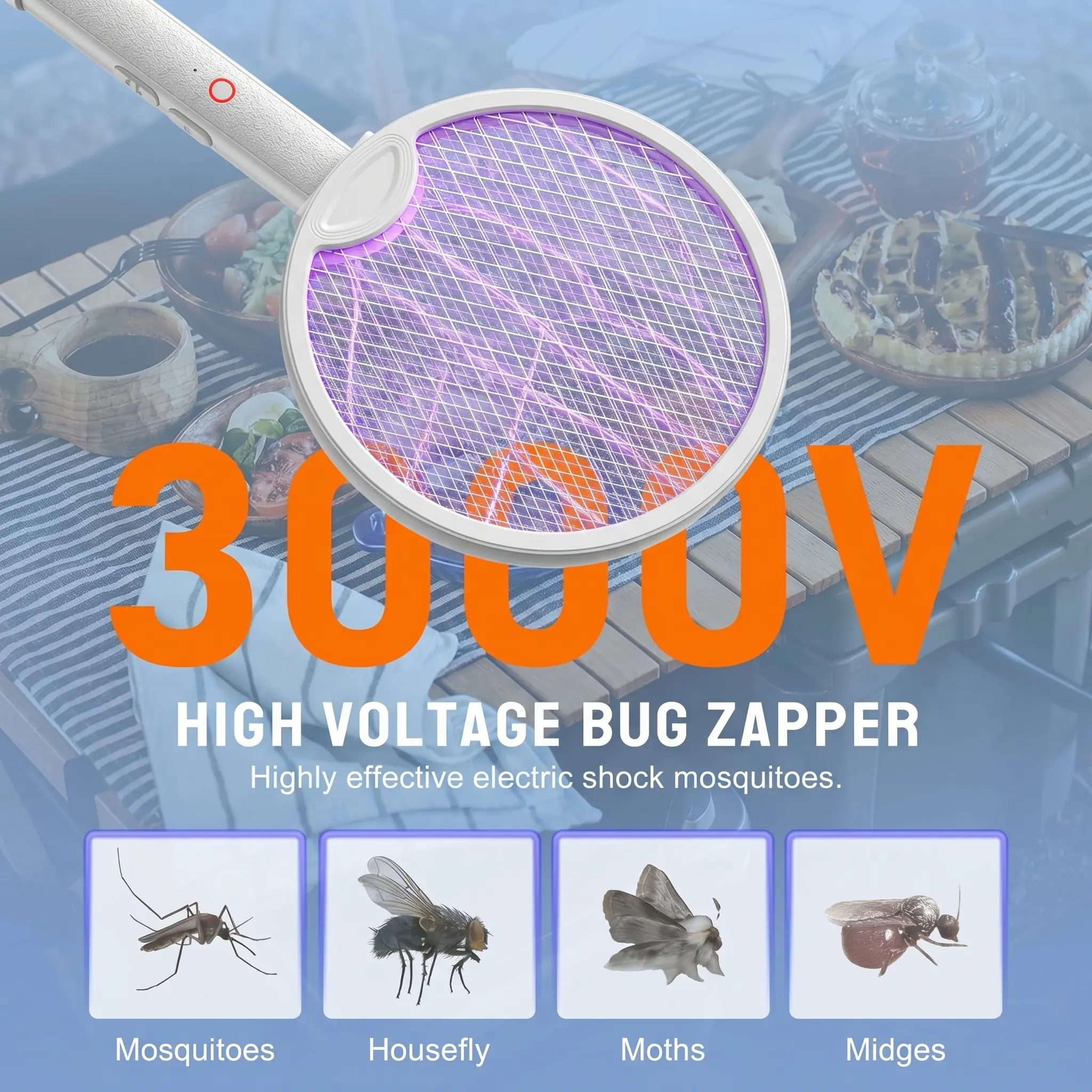 Foldable Electric Fly Swatter Racket 2-in-1 Bug Zapper, 3000V Mosquito Killer with Purple Attractant Light, 1200mAh USB Rechargeable with Support Base, Portable Handheld Mosquito & Insect Killer for Home, Office, Backyard, Patio, Camping