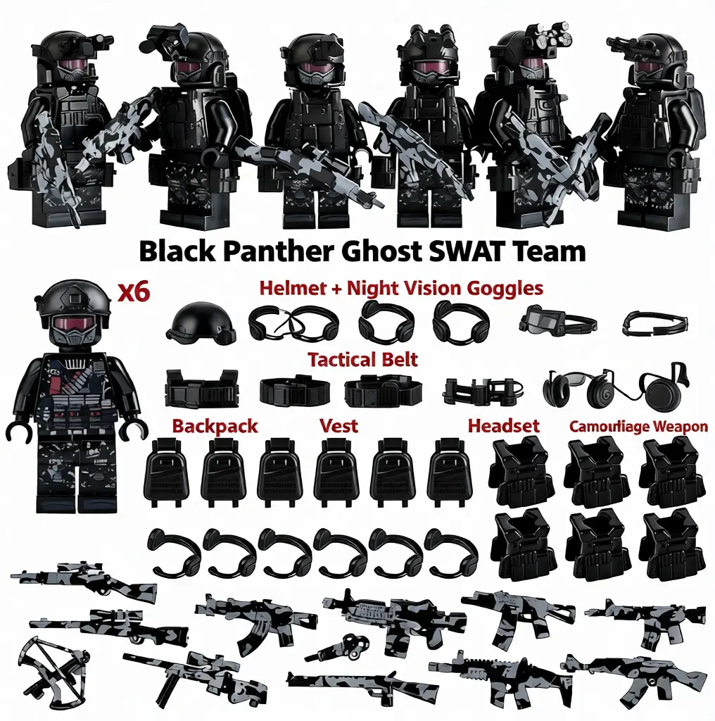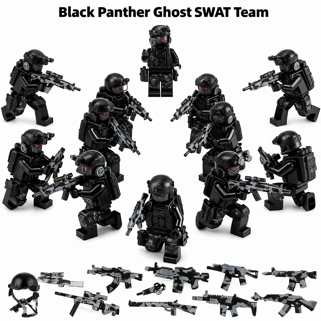 12 PCS Military Building Blocks Set Black Panther SWAT & Ghost SWAT Team Special Forces Ghost Mini Figure Pack Small Bricks STEM Toy for Kids