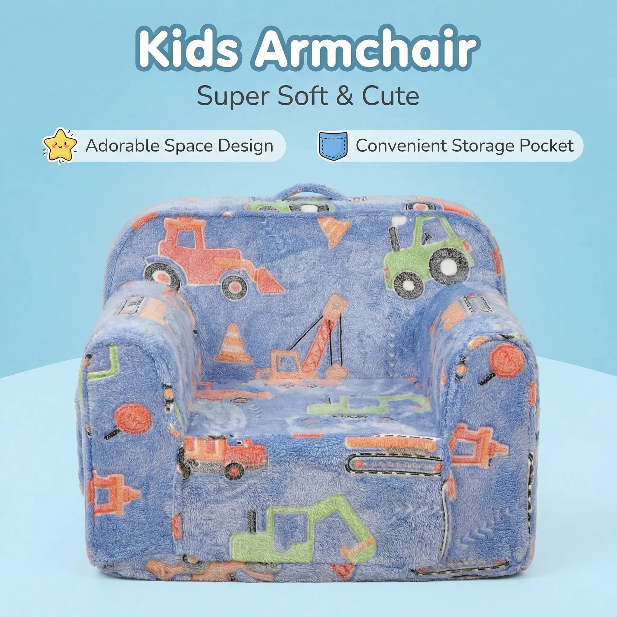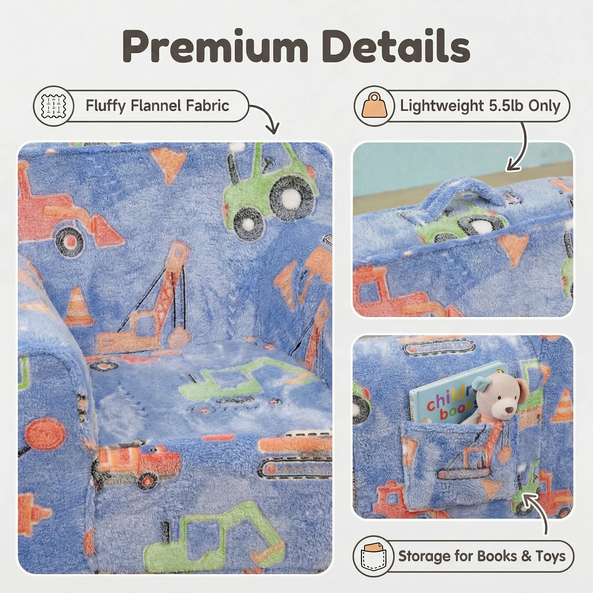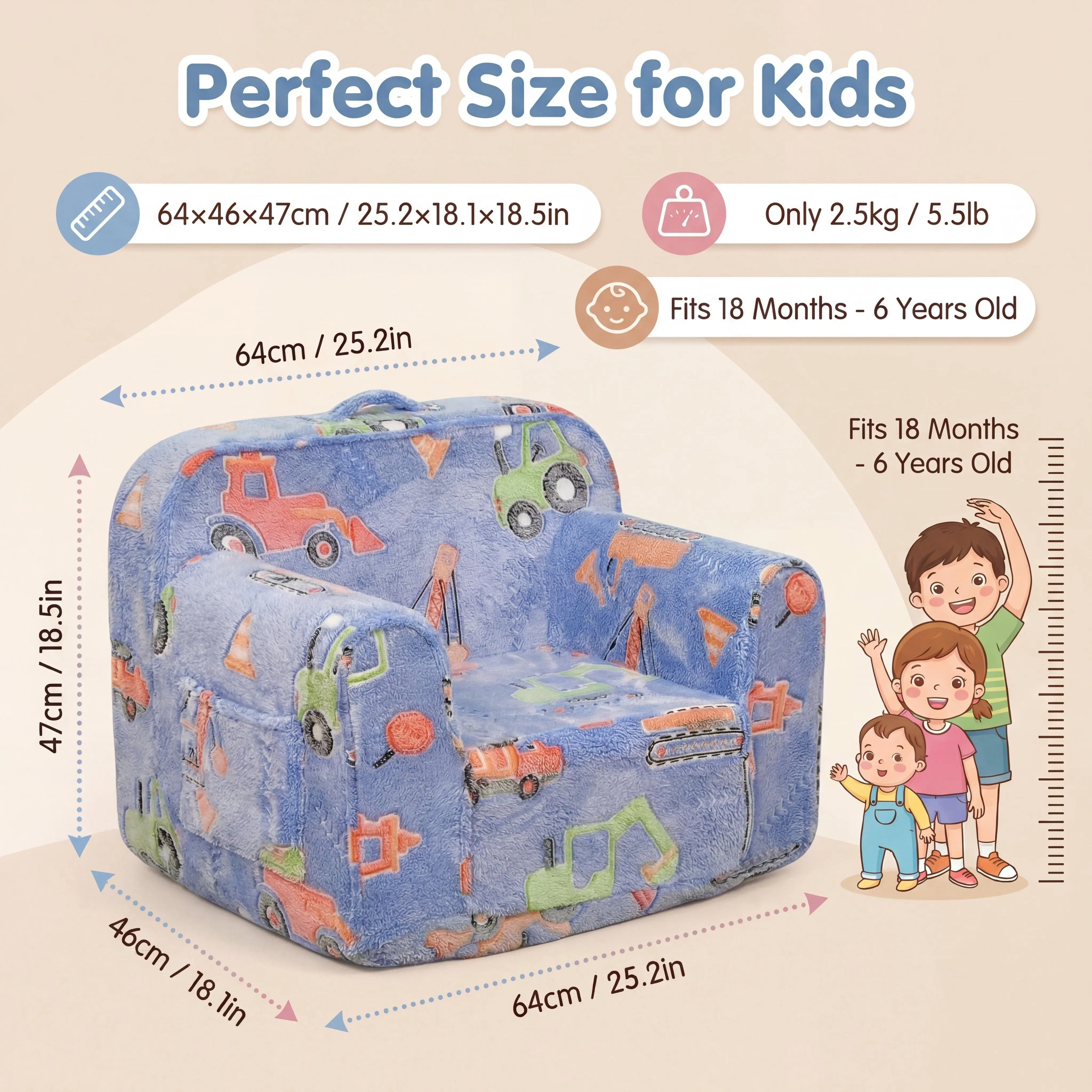 Kids Couch, Comfy 2-6 Years Old,, Toddler Couch Sofa, Kid Sofa for Boys and Girls Gifts, Kids Recliner, Cartoon pattern of blue engineering vehicle