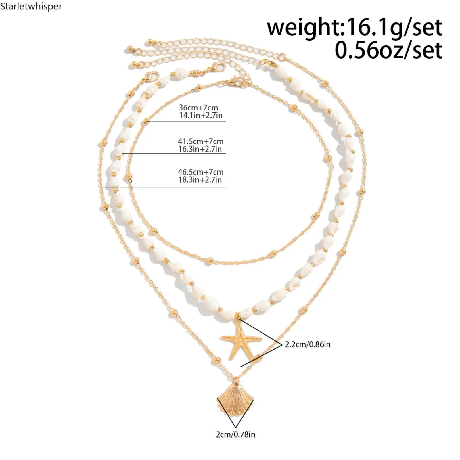 Boho Ocean Beach Starfish & Seashell Pendant Necklace, Layered Multi-Strand Metal Chain Design, Trendy Vacation Jewelry for Women, Perfect for Summer, Beach & Daily Outfits