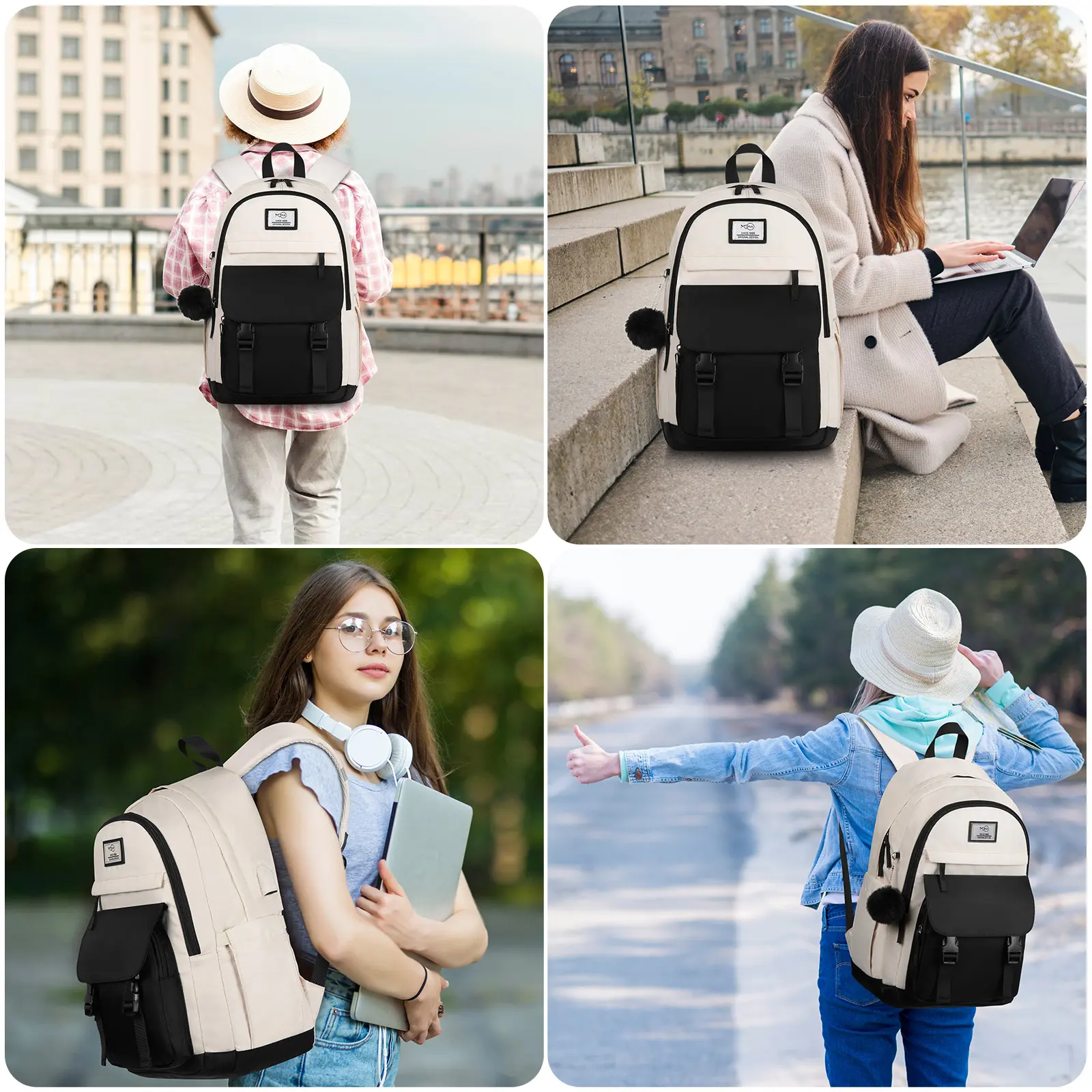 Mtopa 15.6 Inch Large Cute Color Block Backpack with Pom Pom, Water Resistant School Laptop Backpack for Teens, Girls & Students