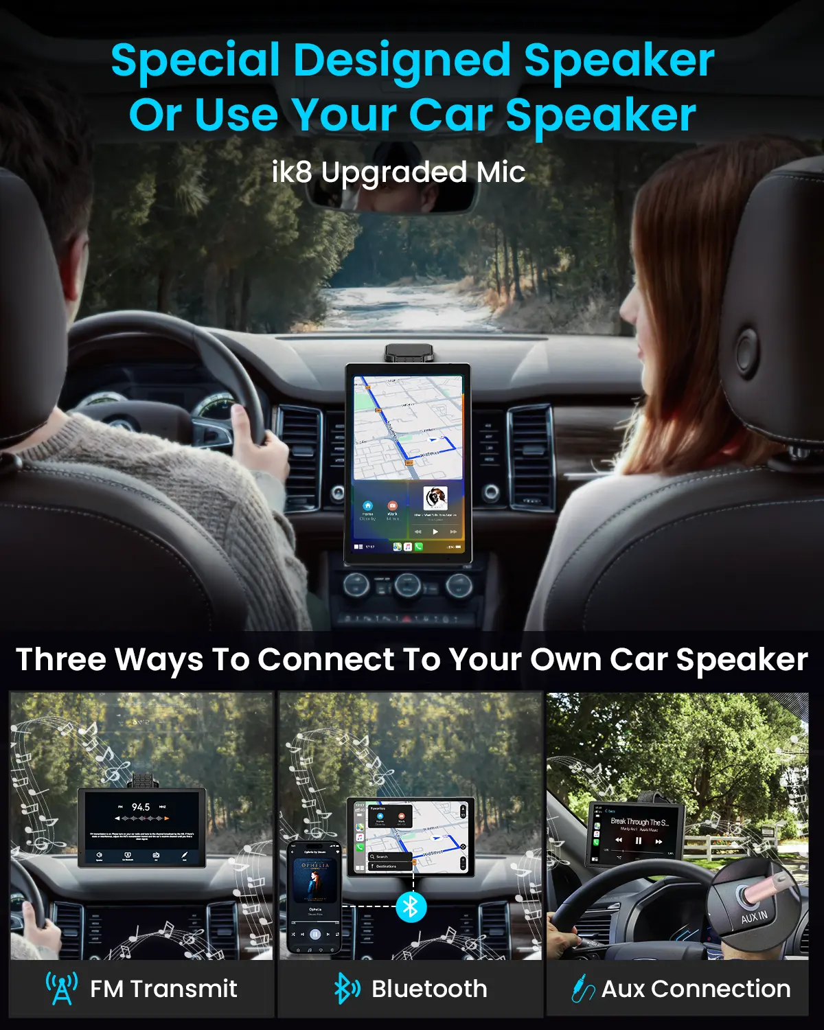 ·3-Way Audio Connection: FM Transmitter, Bluetooth, or AUX Cable, works with ANY car's sound system, upgraded iK8 mic for crystal-clear calls