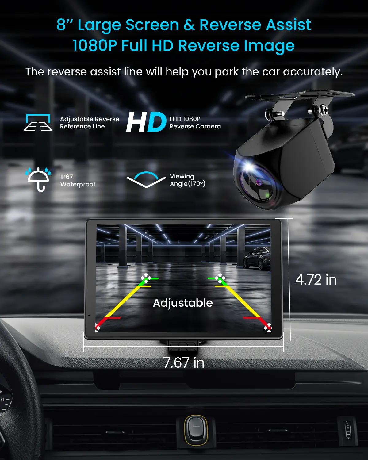·1080P Backup Camera: 170° wide-angle, IP67 waterproof, adjustable parking lines, park safer with zero blind spots