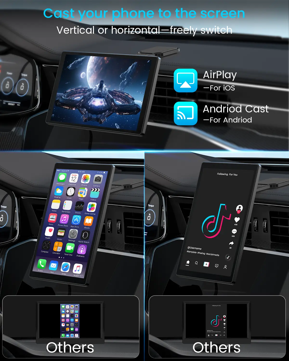 ·AirPlay & Miracast: Cast your phone screen to the big display, stream videos, movies, and TikTok for passengers, freely switch between vertical/horizontal