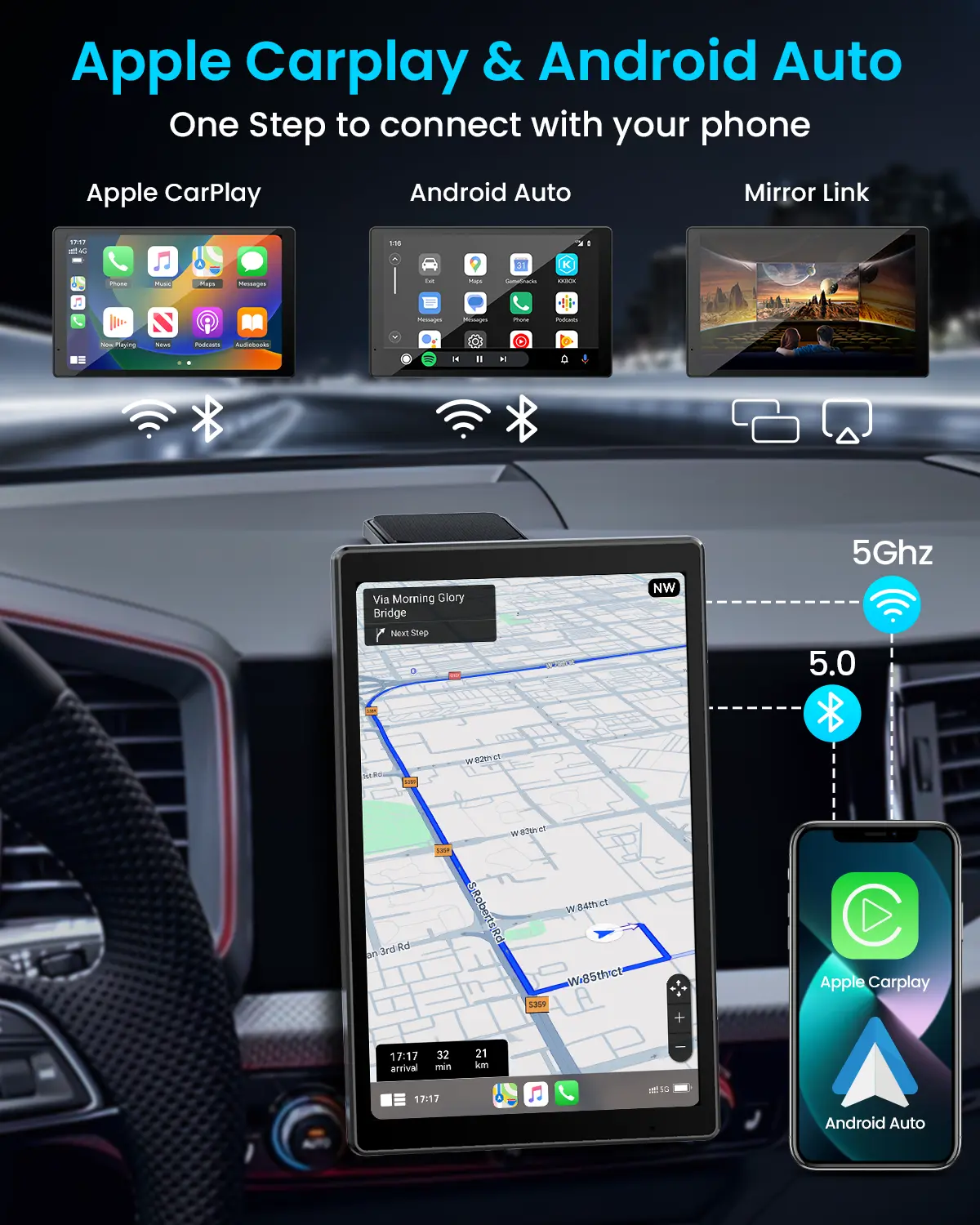 ·Seamless Wireless CarPlay & Android Auto: 5GHz WiFi + Bluetooth 5.0 for instant, lag-free connection, access navigation, music, calls, and messages hands-free