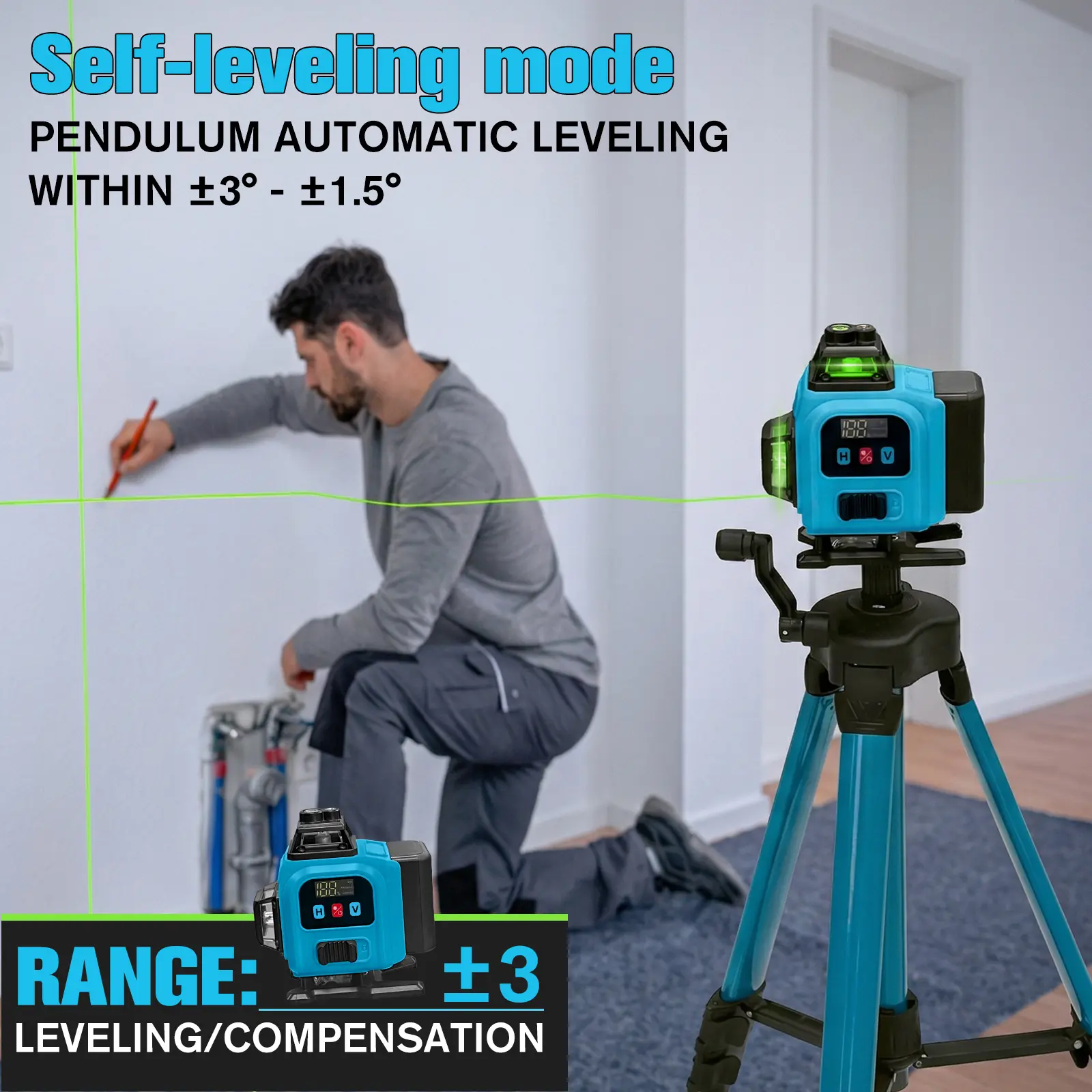 Tanlook Laser Level, 3×360° Self-Leveling Laser Level, 16 Lines Green Beam 4D Laser Level, equipped with 2 lithium batteries, suitable for picture hanging, tile laying, home renovation and indoor projects