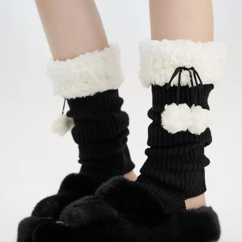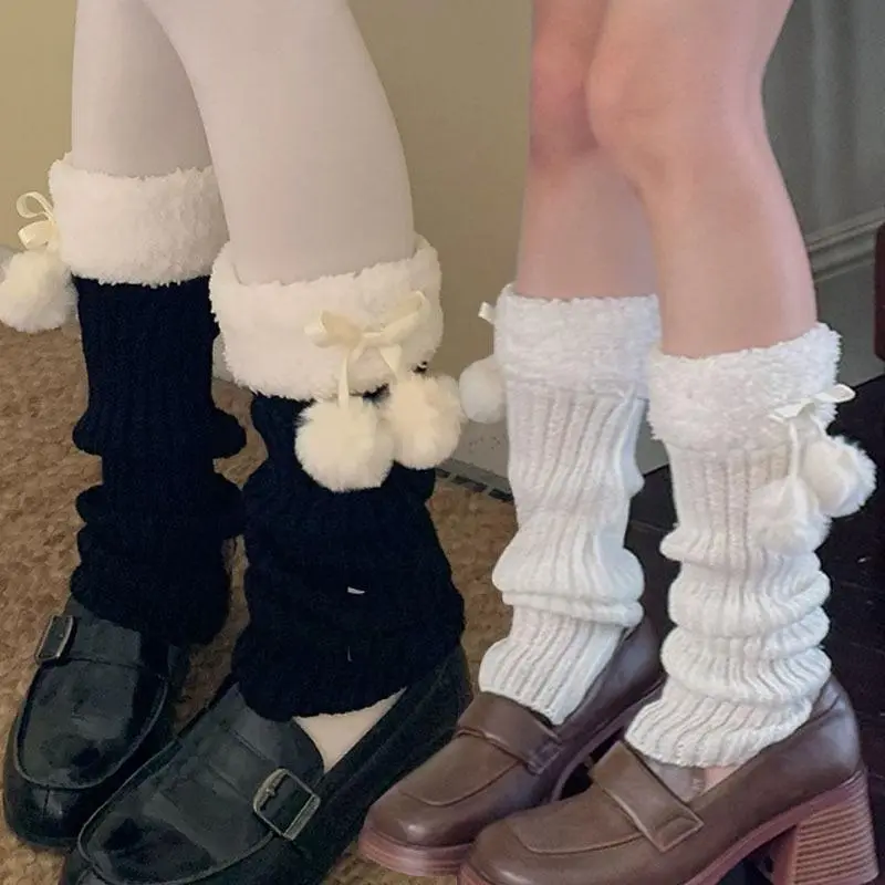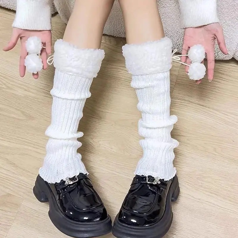 JK Leg Heaters Knitted Lamb Plush Ball Sock Lolita Thickened Winter Warm Socks Foot Cover Woolen Ball Stocking Women Leg Warmers