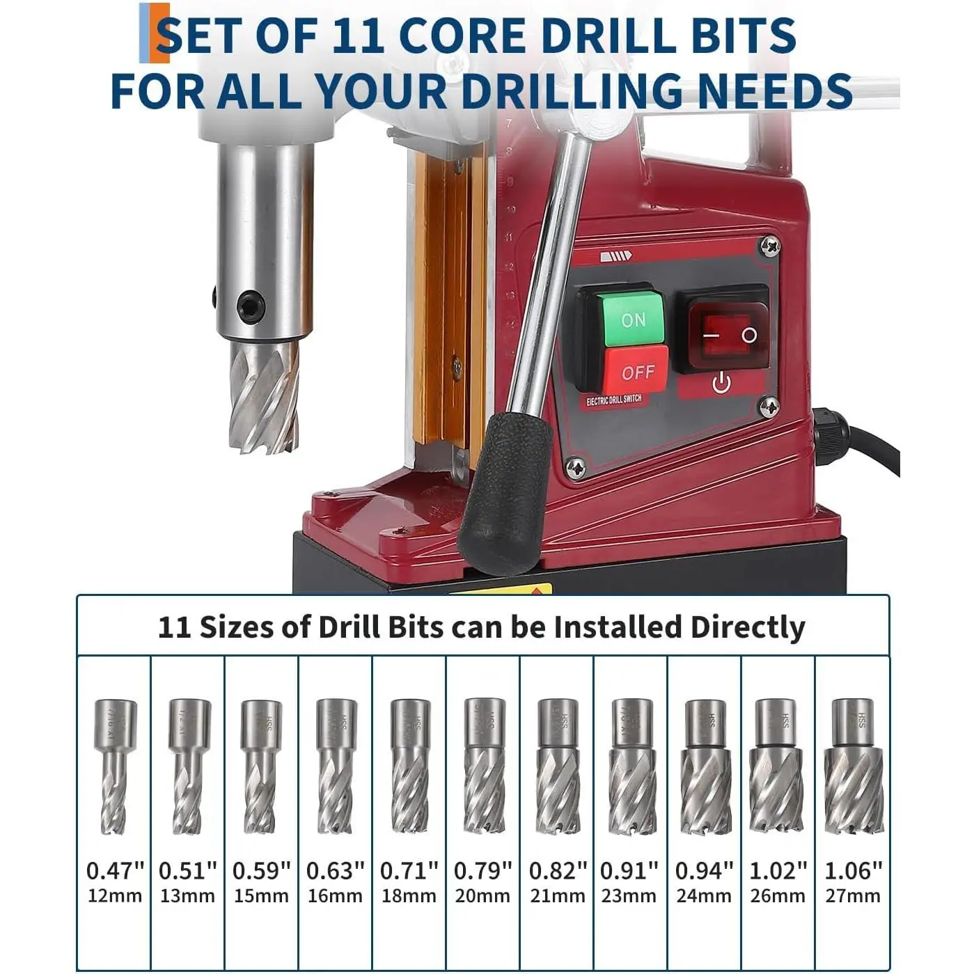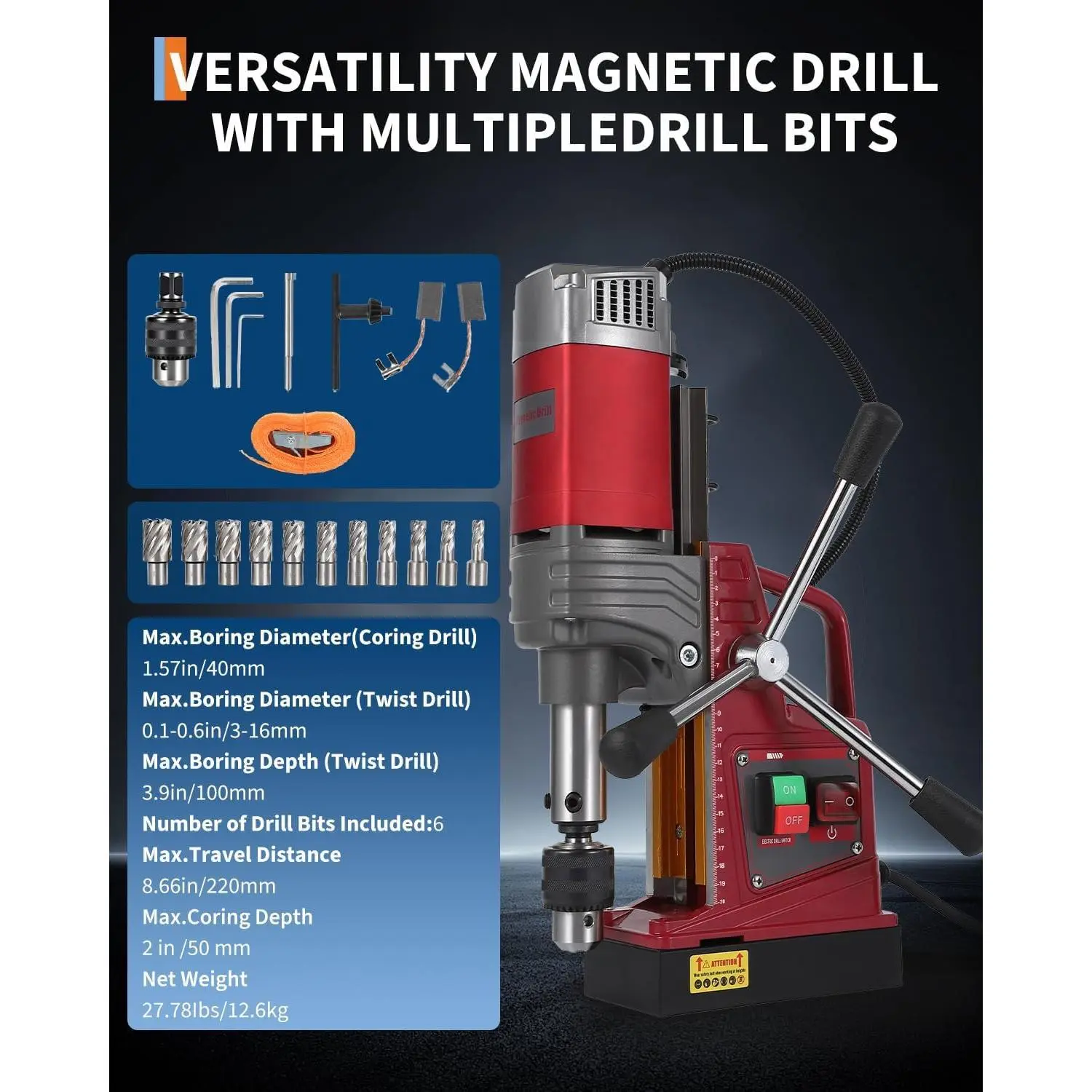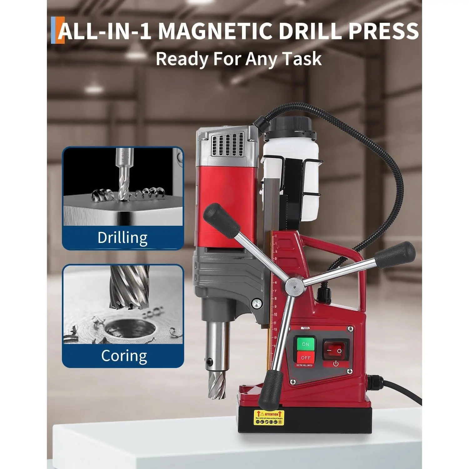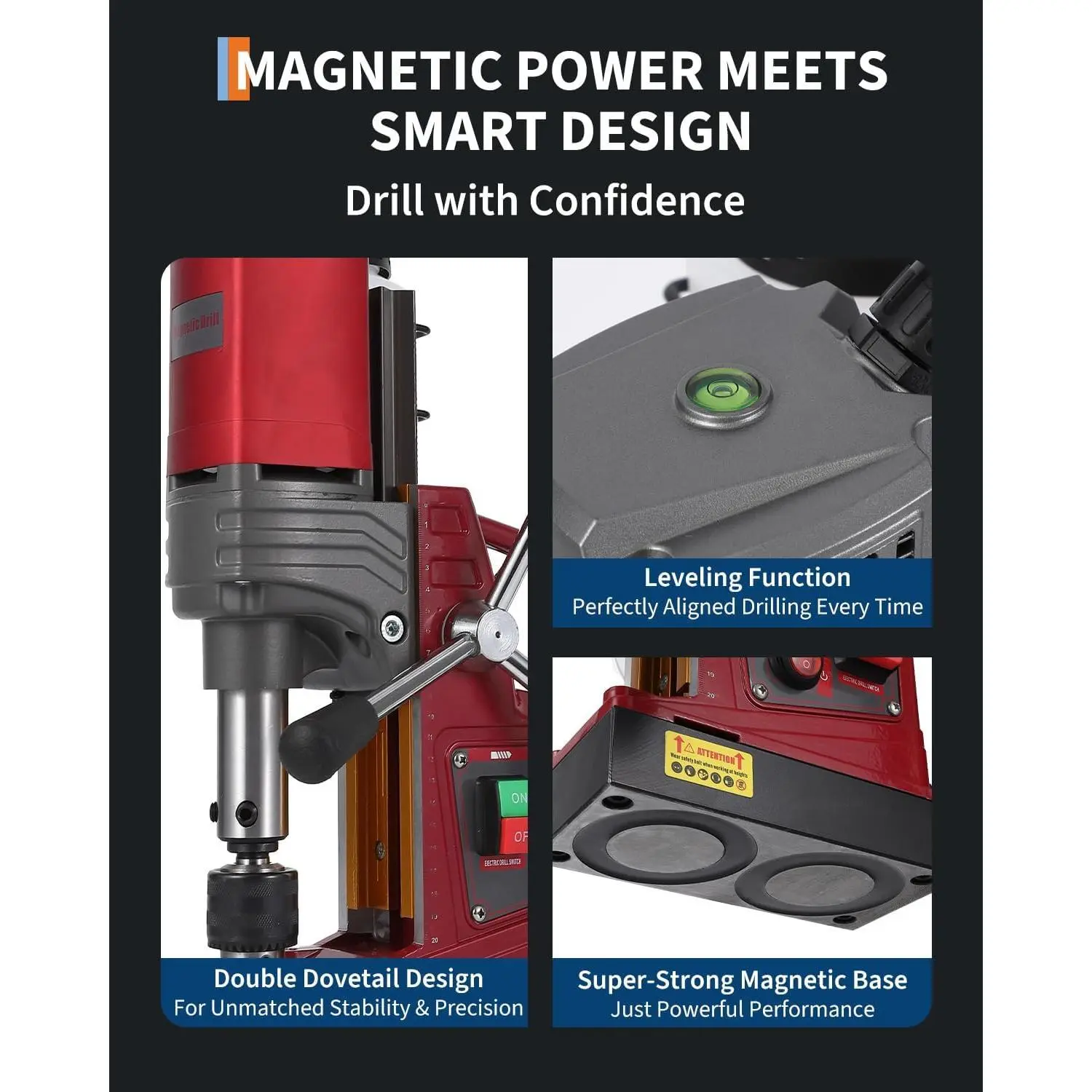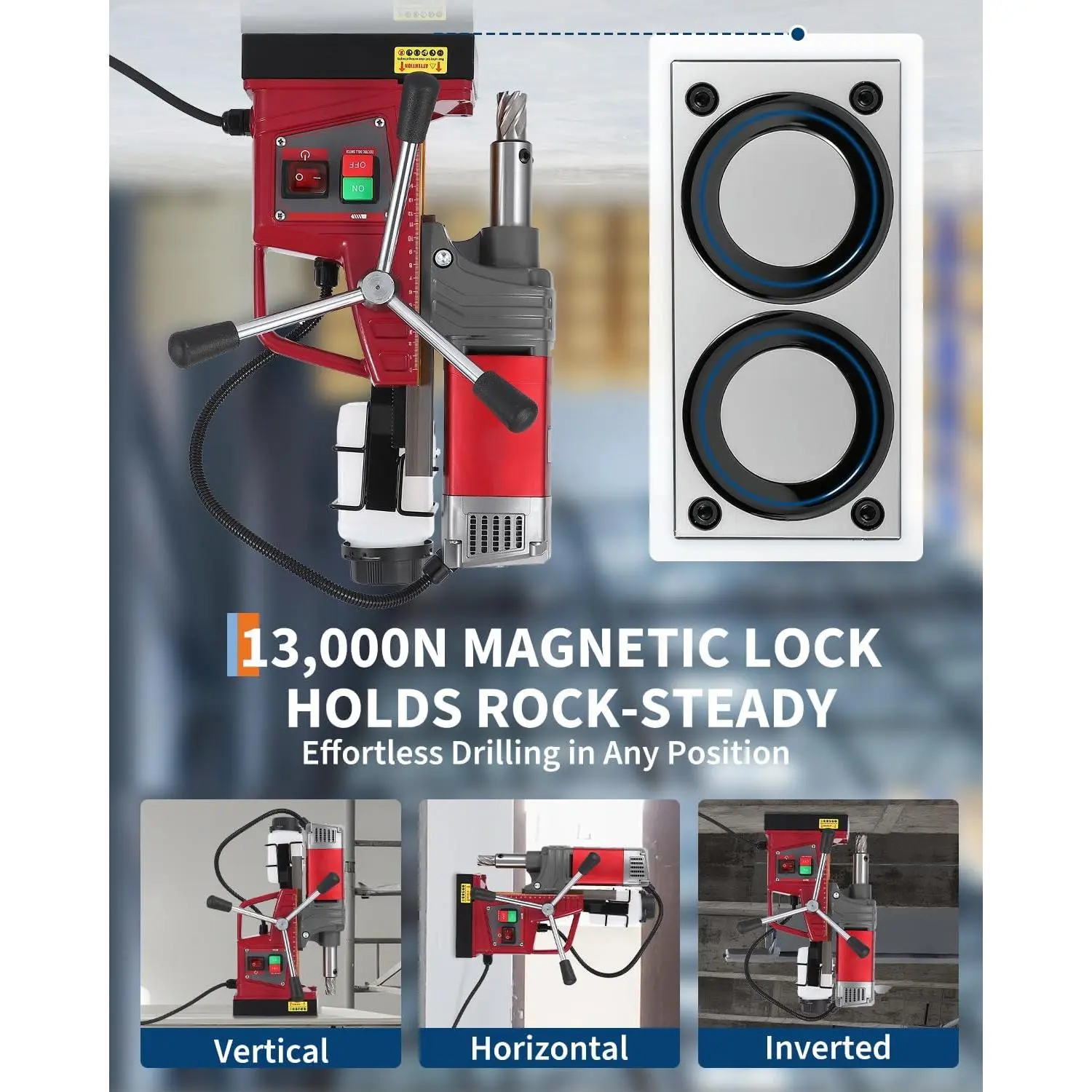 1. Powerful 1450W Motor & 13,000N Magnetic Base: Delivers reliable drilling power with a 13,000N electromagnetic hold—securing the drill firmly on vertical or overhead steel surfaces for safer, more stable operation.