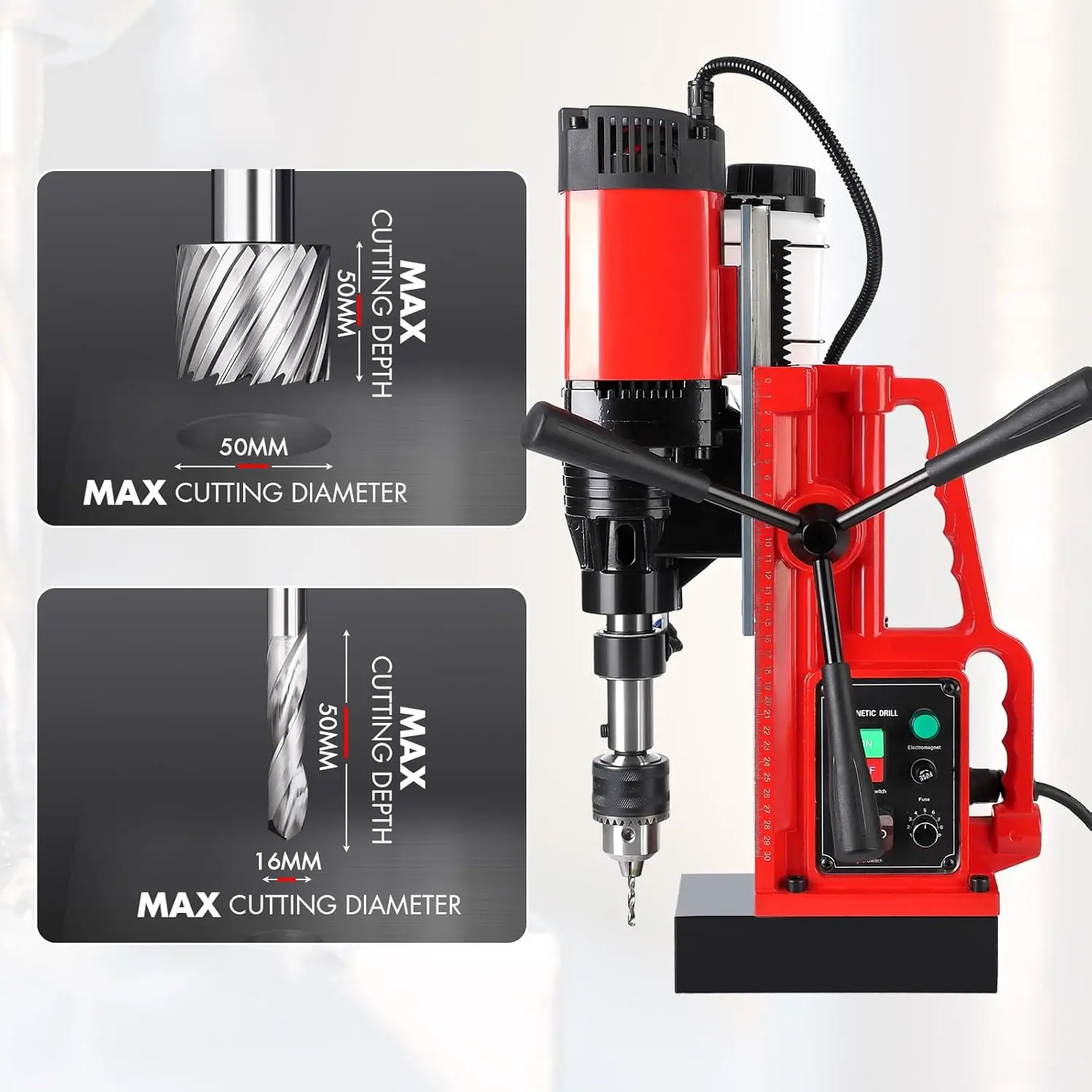 【Powerful & Lightweight Magnetic Drill Press】10-speed 1550 W heavy-duty magnetic drilling machine for cutters up to Ø 50 x 50 mm, twist drills up to 16 mm. GARVEE Magnetic Drill can drill holes in steel or stainless steel with an accuracy of 0.001 mm to 0.005 mm.