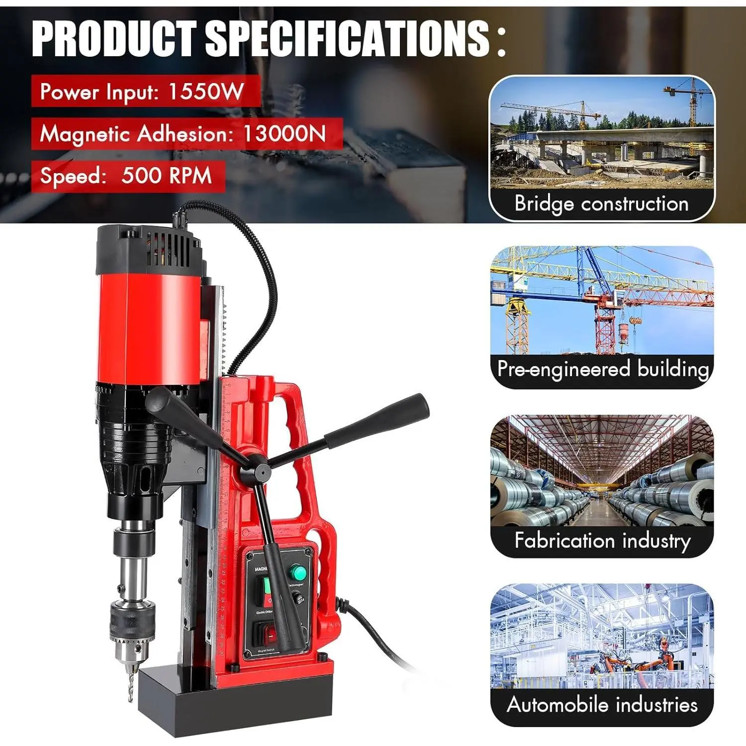 【Portable Magnetic Drill Press】Unlike the conventional drilling machine, GARVEE Electric Magnetic Core Drilling machine is portable and flexible, it can be moved from one place to another, it can be fixed horizontally, vertically, sideways, etc. Such flexibility of working is never achieved by any other drilling machine.