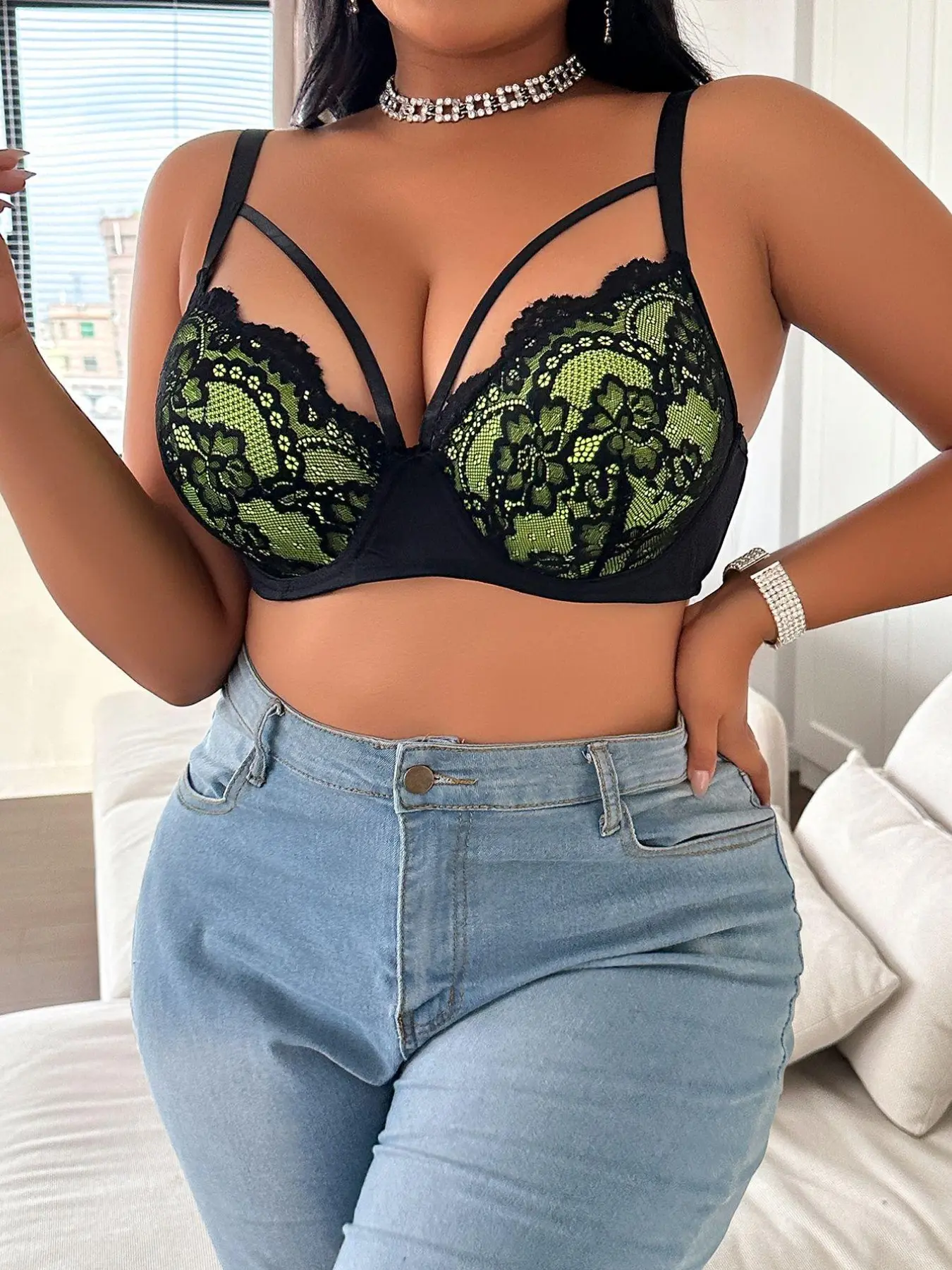 Best-Selling Plus-Size Women's Bra — Single Item: Green Contrast Lace Underwire Lingerie with Crossover Straps; Floral Lace Push-Up Bra Offering Lift and Support — Suitable for Daily Wear or Parties