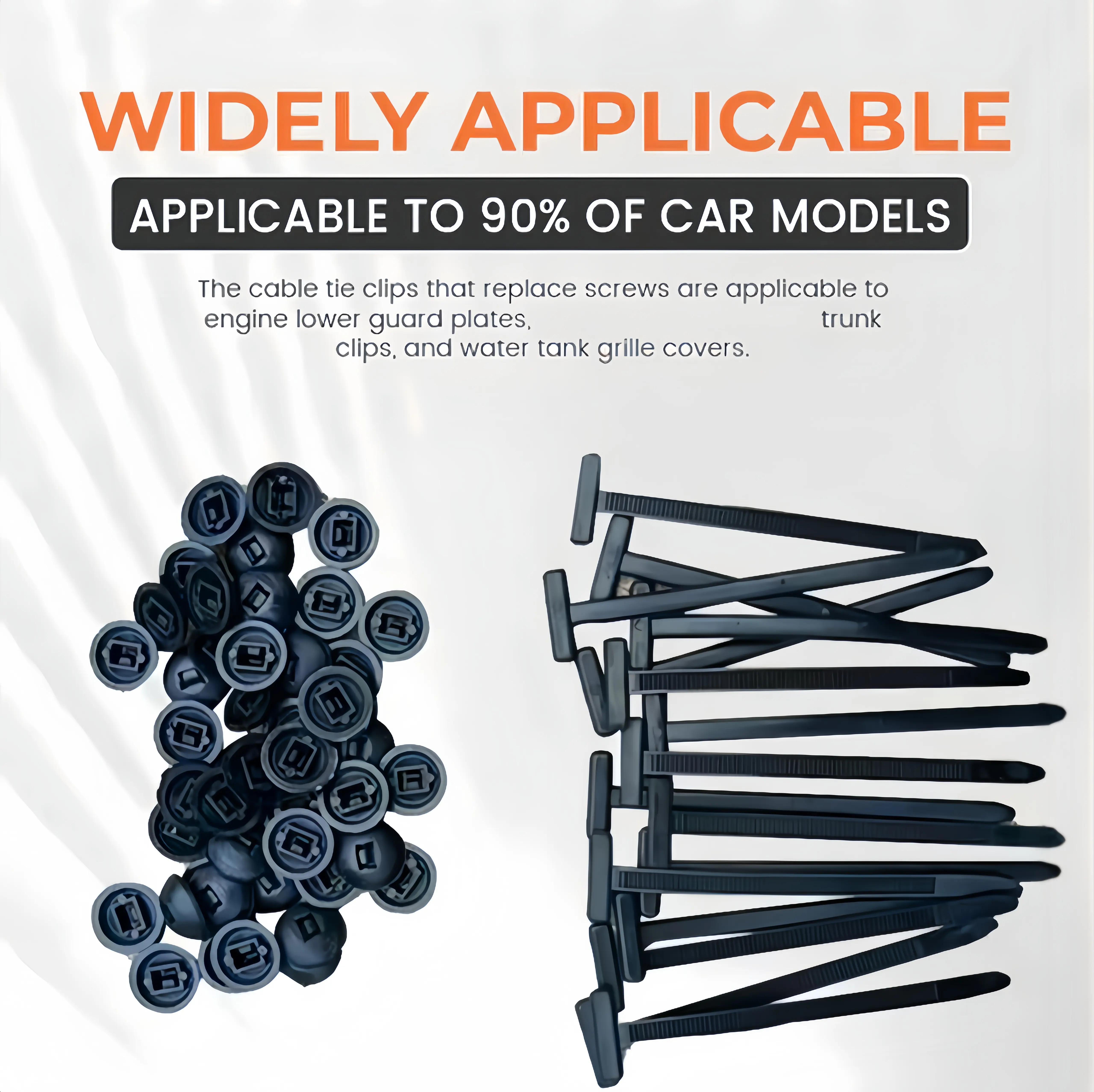 【Nylon Universal Cable Tie Buckle】Trusted Car Fastener Solution. Replacescrews and clips in over 90% of vehiclemodels with these versatile NylonUniversal Cable Tie Buckles, ideal forsecuring bumpers, fenders, trunkliners,engine splash guards, andunderbody panels, A must-have forauto repair and maintenance