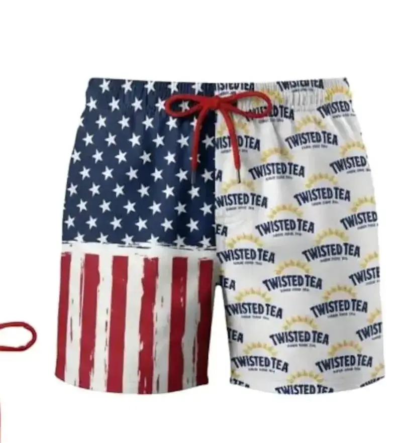 Patriotic USA Flag Couple Swimwear – Twisted Tea Bikini for Women & Matching Mens Swim Trunks, American Flag Beach Outfit for Summer Vacation