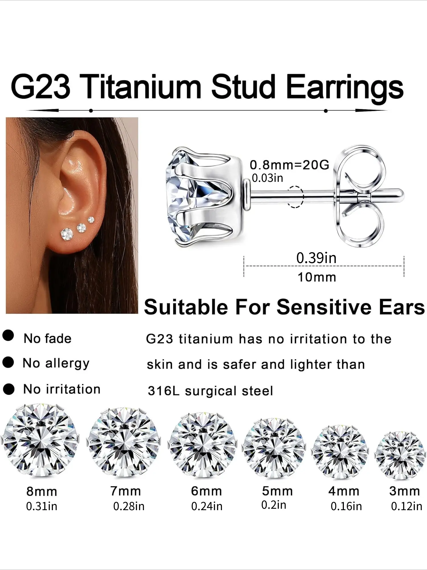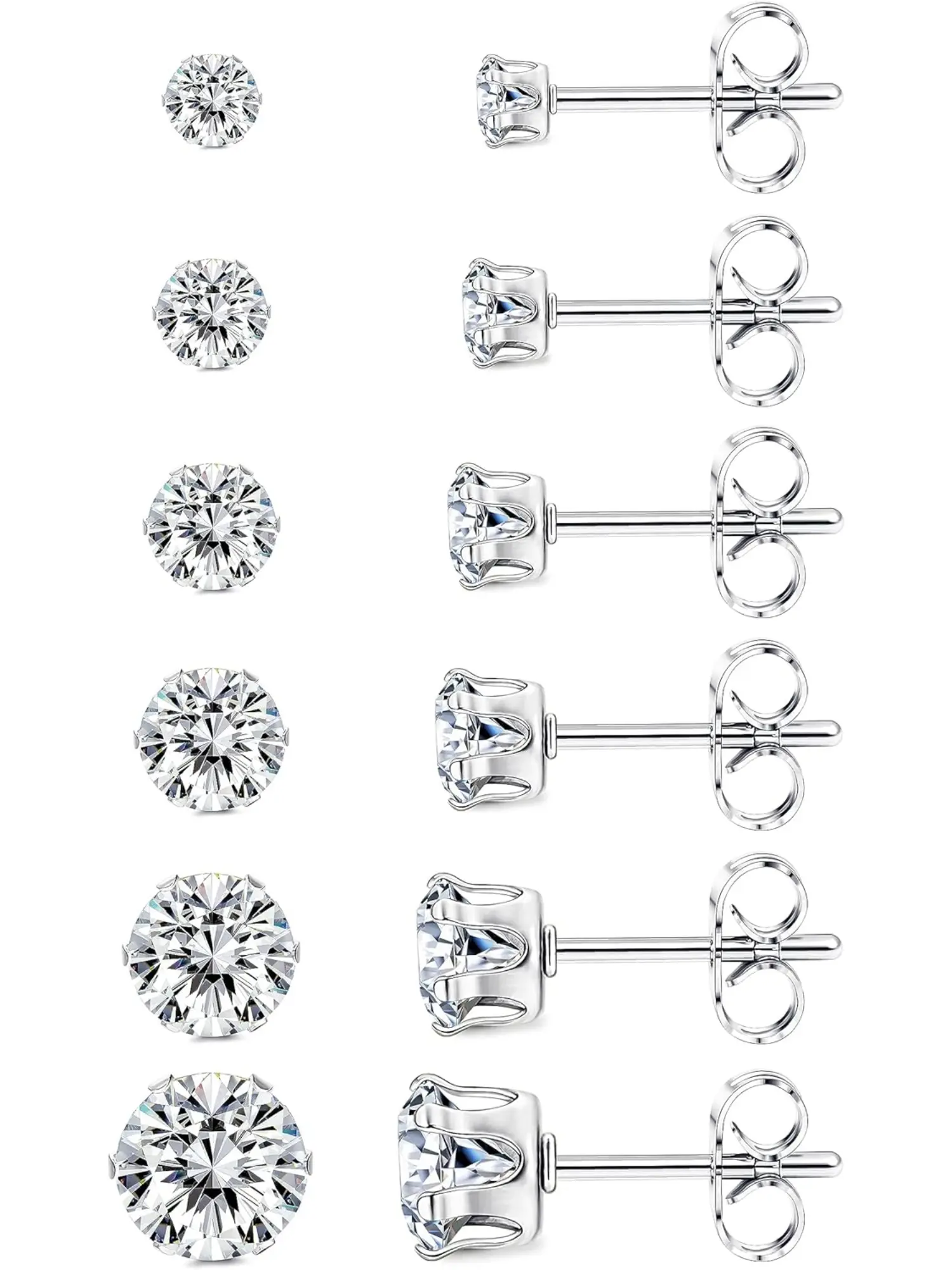 6 Pairs Titanium Stud Earrings for Women Men Cubic Zirconia Hypoallergenic Stud Earrings Set for Sensitive Ears 3-8mm