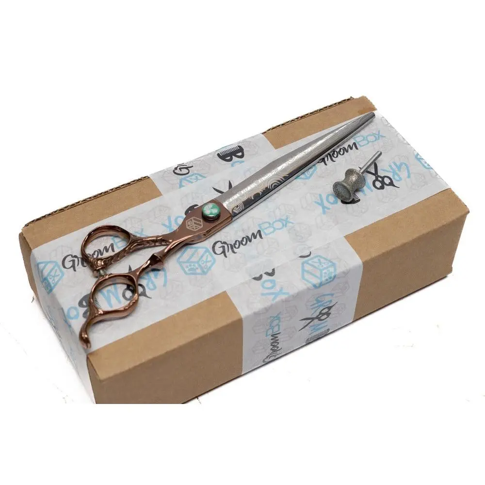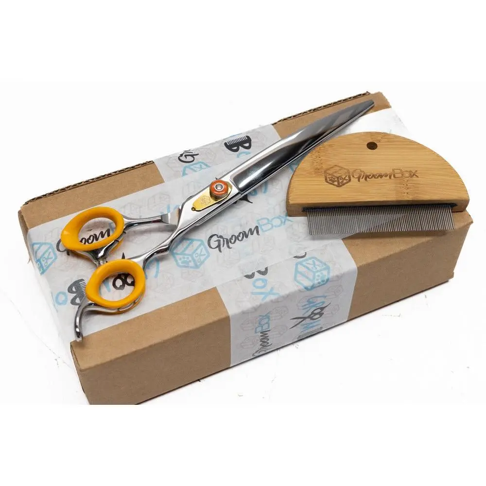 GroomBox Lite contains sizes ranging in 6" to 8" with a free bonus item that may or may not be grooming related. Ships at the end of every month! Styles included range from straight, curved, reversibles, thinners, chunkers, swivels, curved chunkers, and curved thinners.
