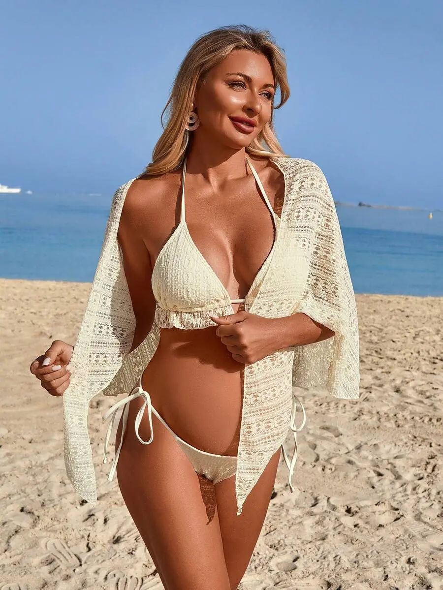 PRINCELY Pregnant Women's Summer Beach Textured Halter Bikini Set And Cover-Up Skirt